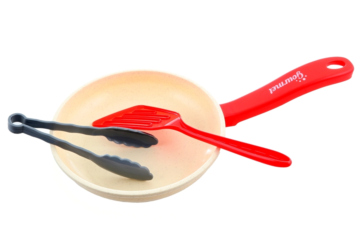 De koekenpan met rood handvat, geperforeerde spatel en tang van duurzaam plastic zijn ontworpen om gemakkelijk vast te houden en veilig te gebruiken.