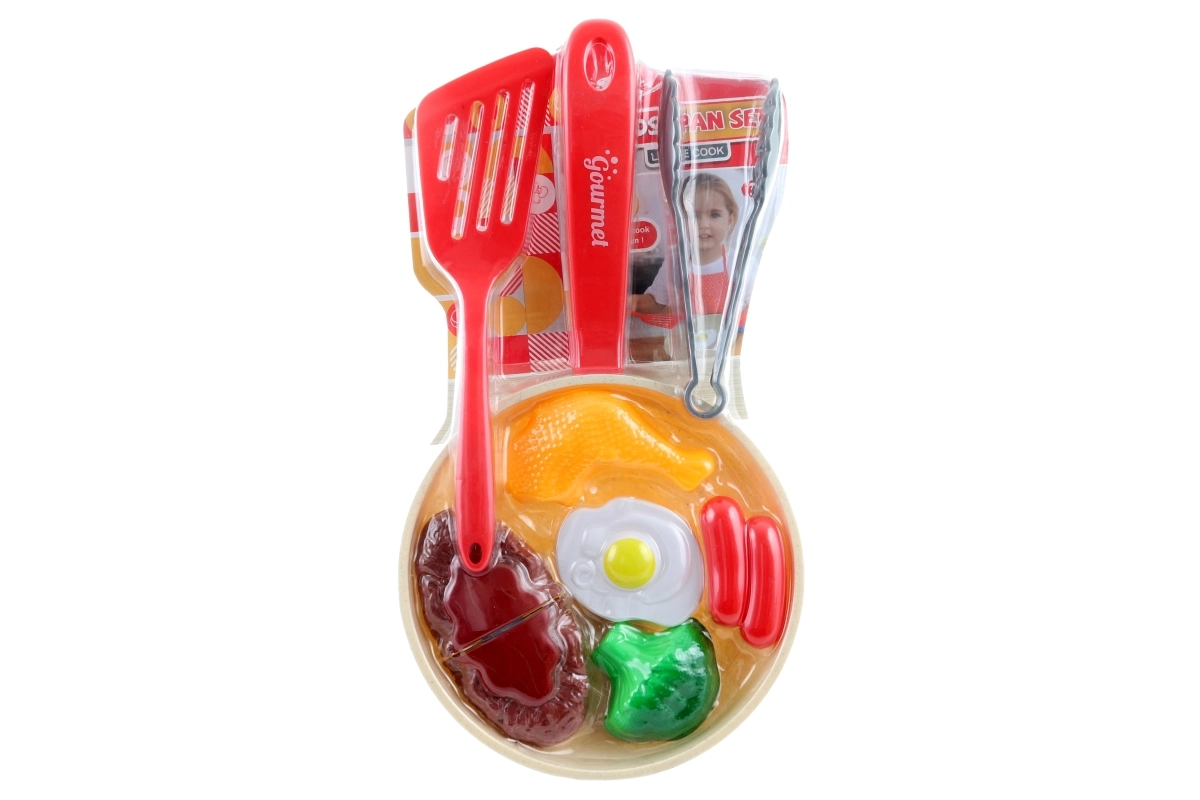 In de set vind je alles wat je nodig hebt: koekenpan, spatel, tang en 5 stuks etenswaren (bijv. ei, steak, worst, vis of groente). De set is gemaakt van kwaliteitsplastic en geschikt voor kinderen vanaf 3 jaar.