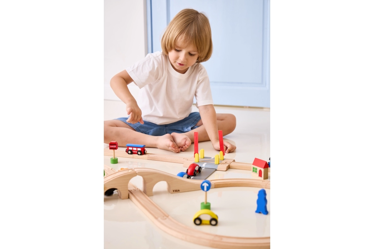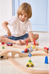 De massieve houten constructie en stevige onderdelen zijn bestand tegen dagelijks spelen. Een ideale aanvulling op speelnsets met treinen, autootjes en verkeersborden.