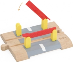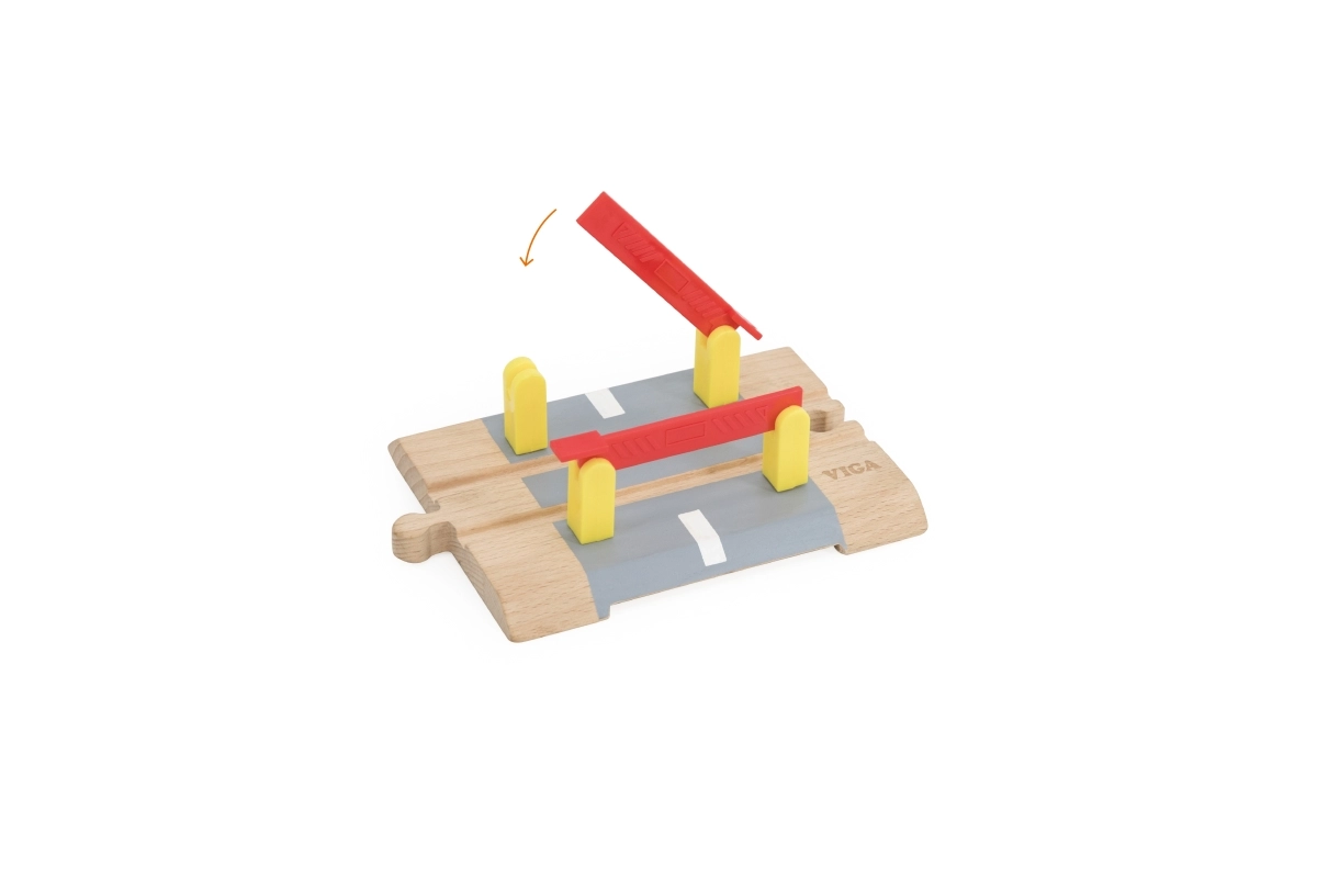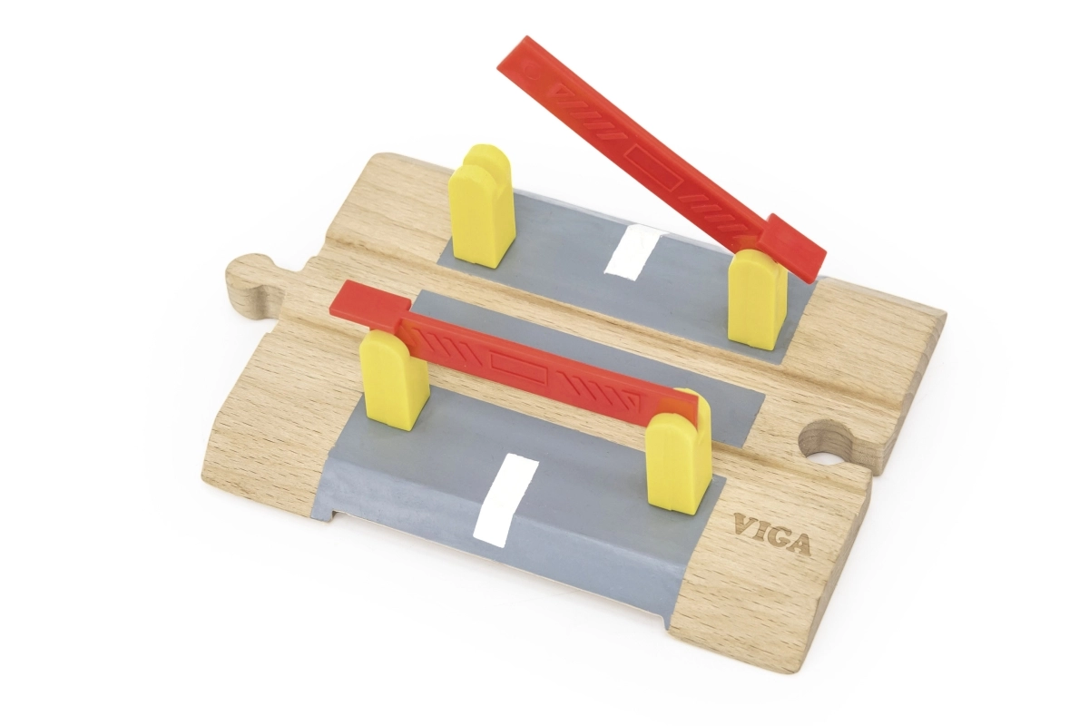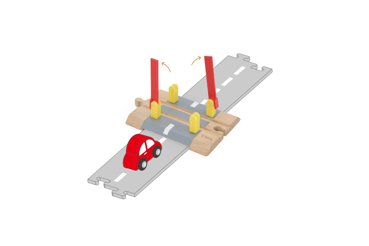 Beide rode slagbomen zijn eenvoudig op en neer te bewegen – kinderen trainen hun fijne motoriek en leren auto’s en treinen op een veilig moment te laten stoppen.