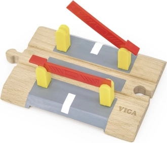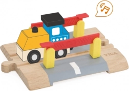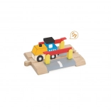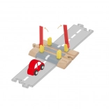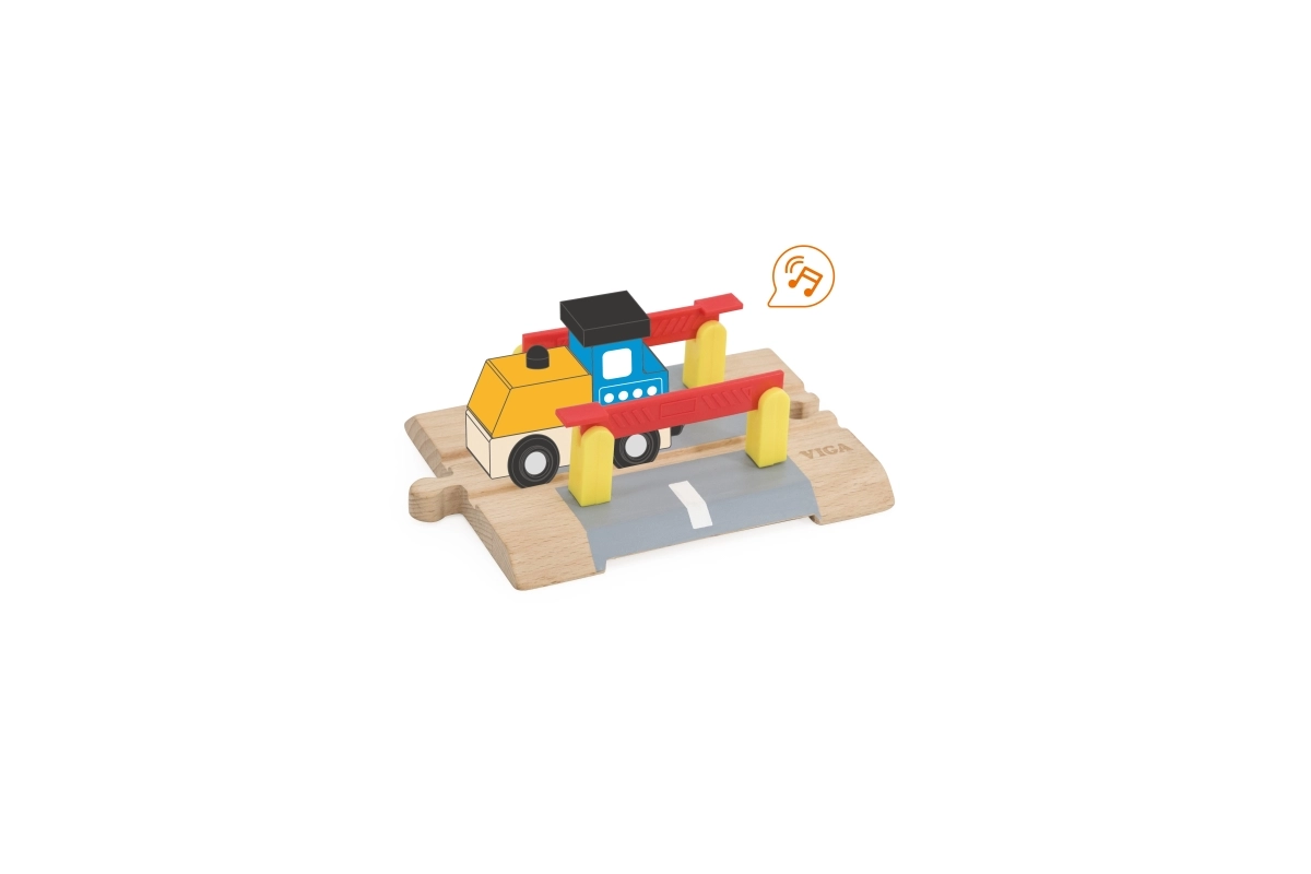 De robuuste houten constructie zorgt voor een lange levensduur en veilig spelen. Compatibele uiteinden maken het eenvoudig te koppelen aan gangbare houten systemen van rails en wegen. Voeding op 2 knoopcelbatterijen geeft de overgang aantrekkelijke effecten die de fantasie en concentratie stimuleren.