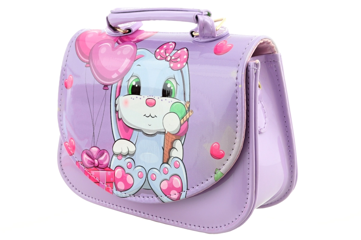 Deze kleine paarse handtas met een schattig konijntje, ballonnen en hartjes valt meteen op. Het glanzende materiaal, de precieze stiksels en de stevige constructie zorgen ervoor dat de tas mooi in vorm blijft en bestand is tegen dagelijks gebruik. Eén overzichtelijk vak en een eenvoudige drukknoopsluiting maken het dagelijks gebruik gemakkelijk.