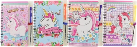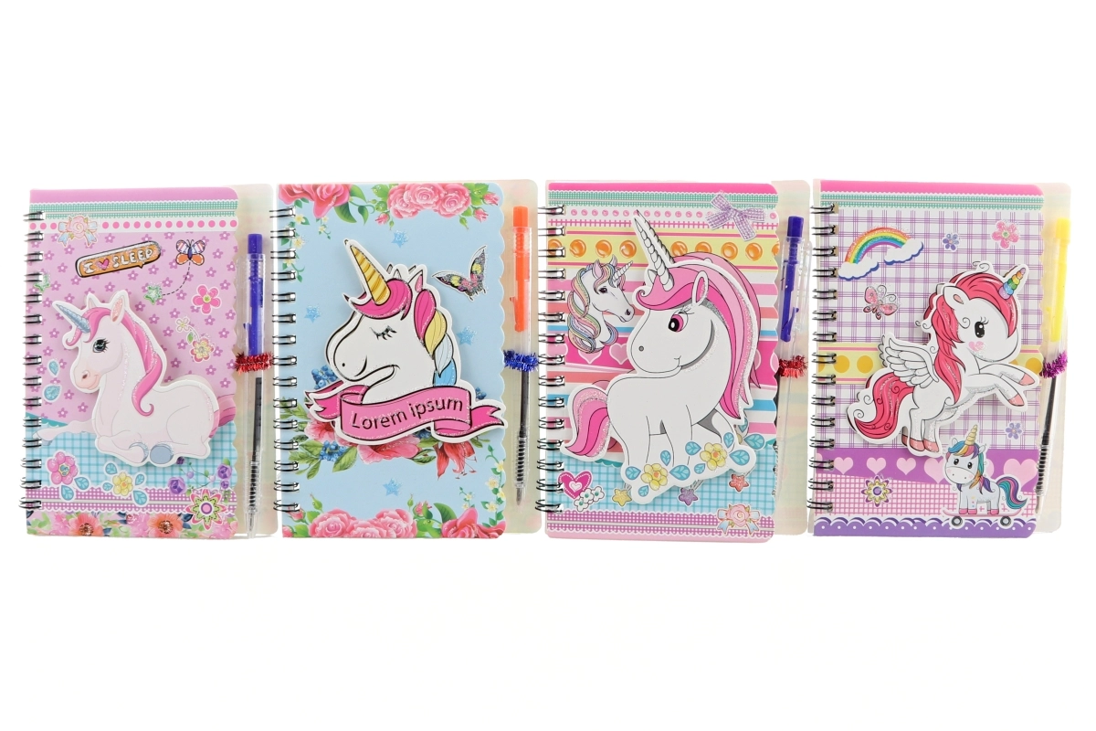 Vrolijk notitieboek met eenhoorntjesmotief en praktische pen, perfect voor kleine én grote liefhebbers van schattige accessoires. Bevat 30 gelinieerde, gekleurde bladen, heeft compacte afmetingen van 10,5 × 14 × 0,5 cm en is ideaal voor in handtas, rugzak of school. Levering in meerdere varianten afhankelijk van voorraad.