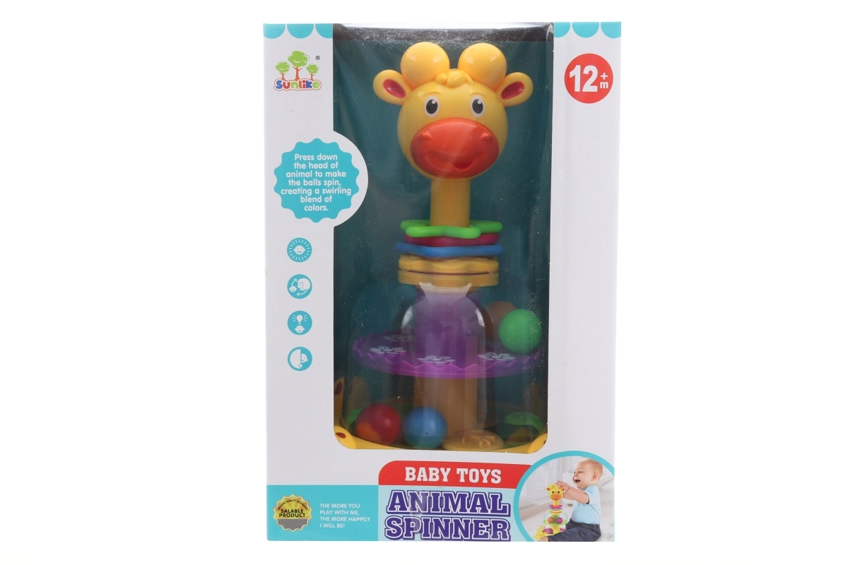Deze vrolijke draaitol in de vorm van een giraf brengt kinderen plezier in beweging en ontdekking. Met een simpele druk op de kop van de giraf gaan de binnenste delen met balletjes draaien, wat een boeiend visueel effect creëert en kinderen motiveert om telkens opnieuw te spelen. De tol is ideaal voor de ontwikkeling van fijne motoriek, oog-handcoördinatie en kleurherkenning.