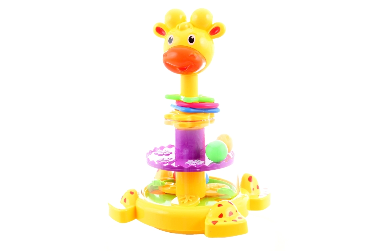 Intuïtief mechanisme: door zacht op de kop van de giraf te drukken gaan de gekleurde balletjes en ringetjes in de transparante kamer draaien.