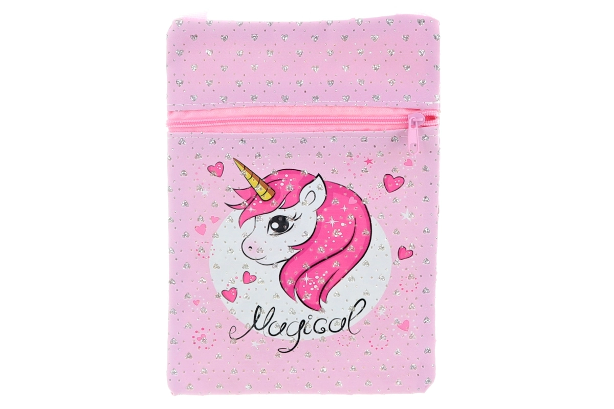 Stijlvolle schoudertas met een schattig eenhoornmotief die zowel kleine als grote fantasyliefhebbers zal verrassen. Biedt een praktisch ritsvak, een comfortabele schouderriem en compacte afmetingen die ideaal zijn voor kleine spulletjes.