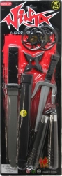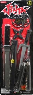 Inhoud van de verpakking: samuraizwaard met schede van ongeveer 36 cm, dolk, nunchaku en 3 shuriken (werpsterren). Een uitstekende keuze voor carnaval, verkleedpartijen of avonturen thuis.