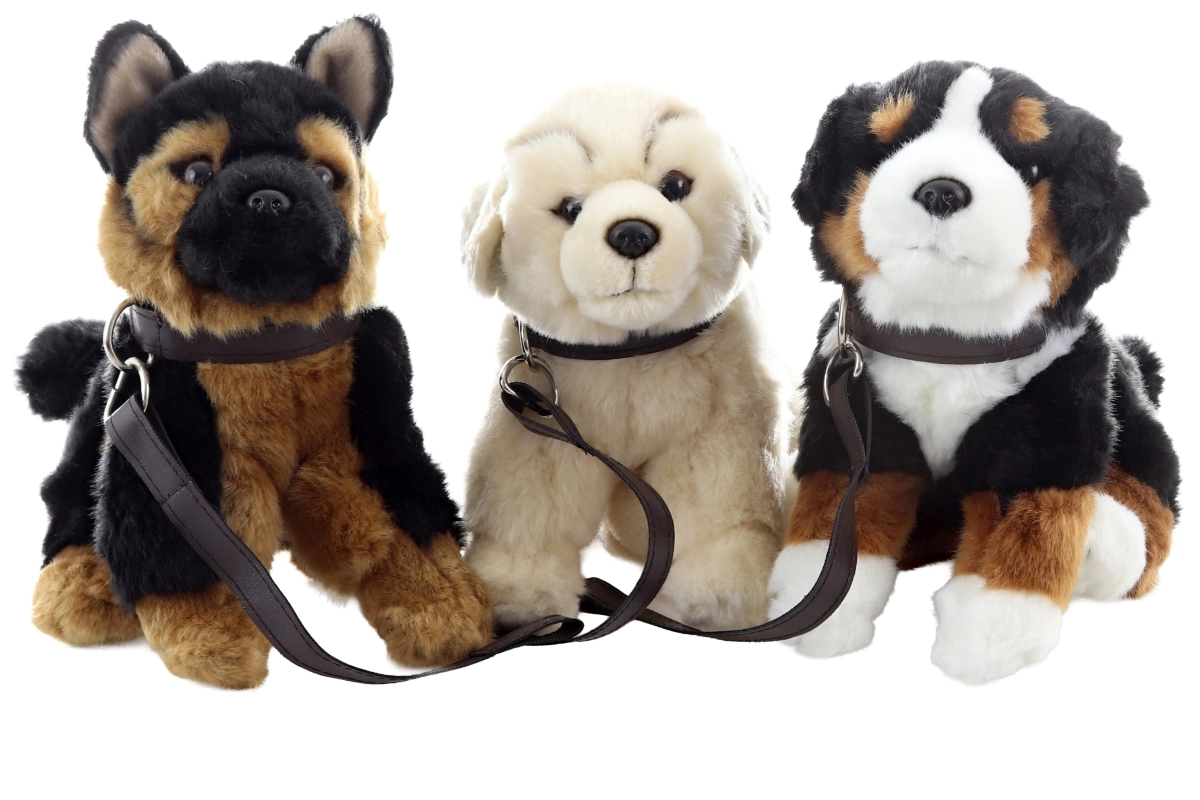 Elke hond heeft realistische details (geborduurde ogen en neus), een aangename korte pluche en een stevige halsband met riem voor wandelrollenspel. We kiezen uit 3 rassen afhankelijk van de actuele beschikbaarheid.