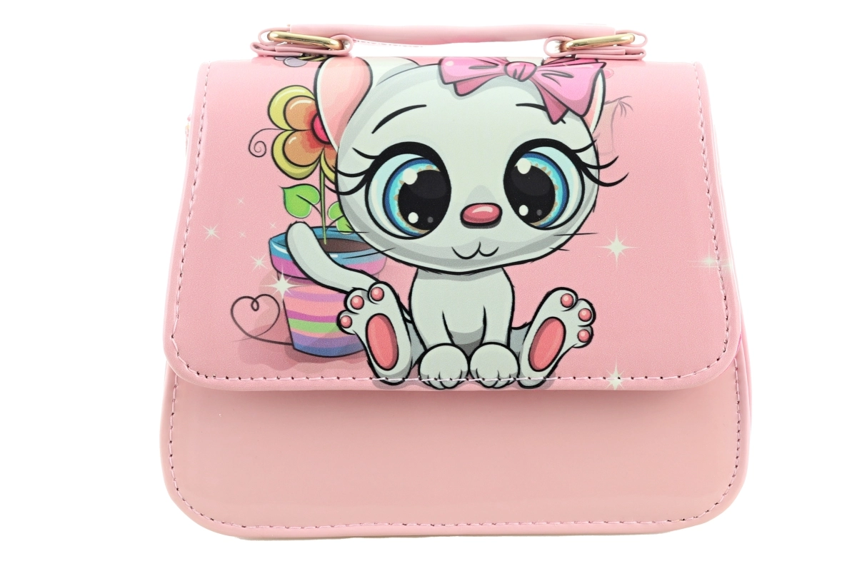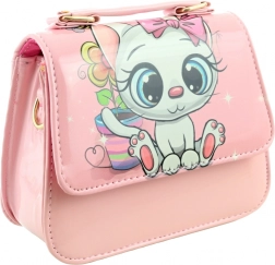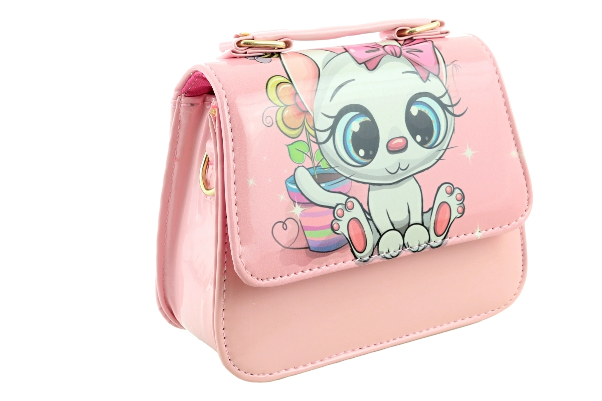 Een schattige kinderhandtas met een kattenmotief waar kleine dametjes dol op zullen zijn. Hij biedt een glanzend oppervlak, praktische drukknoopsluiting en één binnenvak voor kleine spulletjes. Ideaal voor wandelingen en feestelijke gelegenheden.