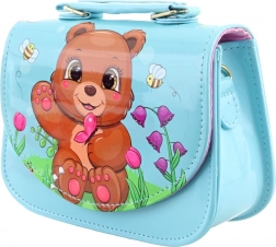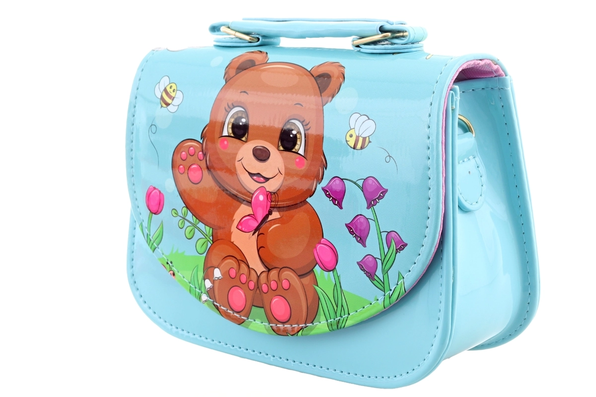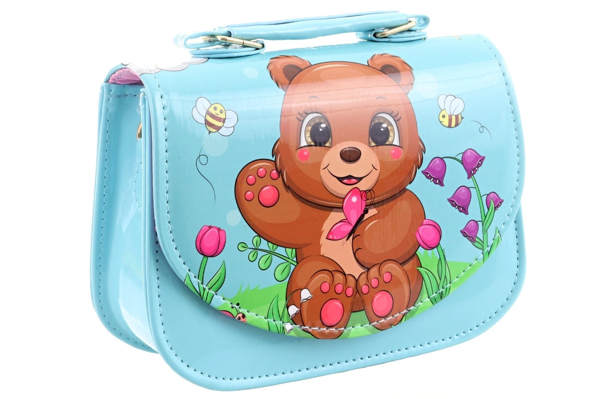 Een schattige kinderhandtas in lichtblauw met een beertje die kleine fashionista’s zal verrukken. Heeft een glanzend, gemakkelijk afwasbaar oppervlak, praktische drukknoopsluiting en één hoofdvak voor kleine spulletjes. De compacte afmetingen 18 × 14 × 7 cm zijn ideaal voor zakdoekjes, kleine speeltjes of accessoires. Het product is geen speelgoed.