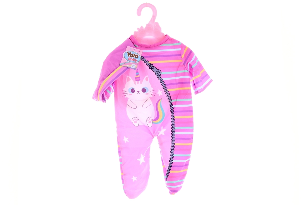 Schattige set poppenkleding met kattenmotief, inclusief comfortabel boxpakje en bijpassend mutsje. Ideaal voor poppen van circa 32 cm, gemakkelijk aan te trekken en perfect voor kinderspel en het stimuleren van de fantasie. Zacht materiaal, praktische verpakking aan hangertje en lief design zullen elke kleine poppenouder blij maken.