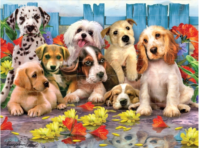 Een kleurrijke illustratie vol puppy’s en bloemen die zowel kinderen als volwassenen aanspreekt en uitnodigt om steeds opnieuw te puzzelen.