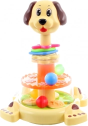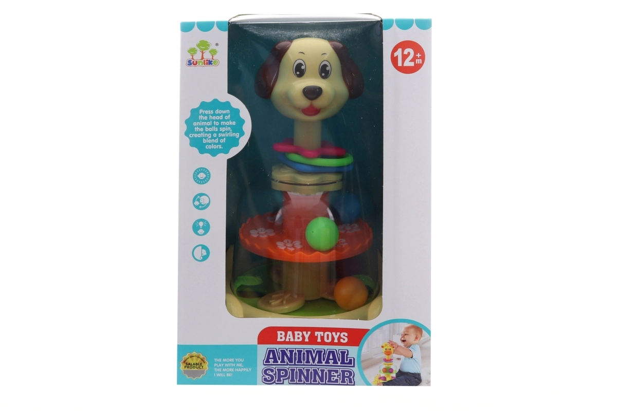 Deze schattige tol met hondjesmotief maakt elke kleine ontdekker blij. Met een simpele druk op het kopje wordt het mechanisme geactiveerd en gaan de gekleurde knikkers binnenin draaien. Het speelgoed bevordert de oog-handcoördinatie en leert het kind oorzaak en gevolg.