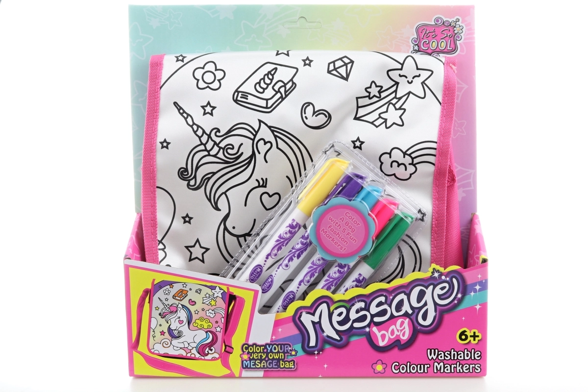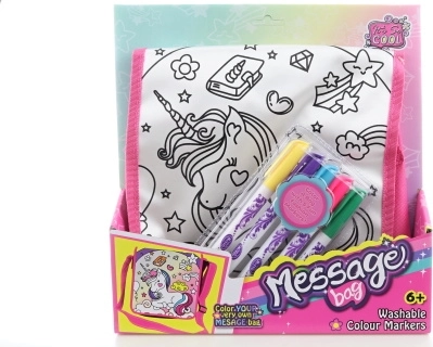 Creatief inkleur-handtasje met een schattig eenhoornmotief dat elk creatief kind blij maakt. Inclusief verstelbare roze schouderriem en een set van 5 kleuren om meteen in te kleuren. Het tasje heeft een praktische klittenbandsluiting en is ideaal voor kleine spulletjes en voor onderweg. Bevordert creativiteit, gemakkelijk in gebruik en plezier voor kinderen 3+.
