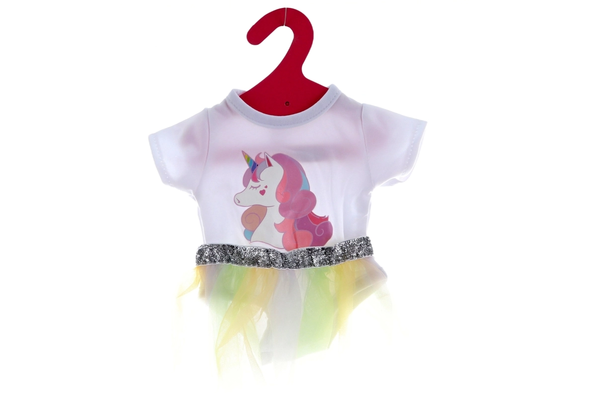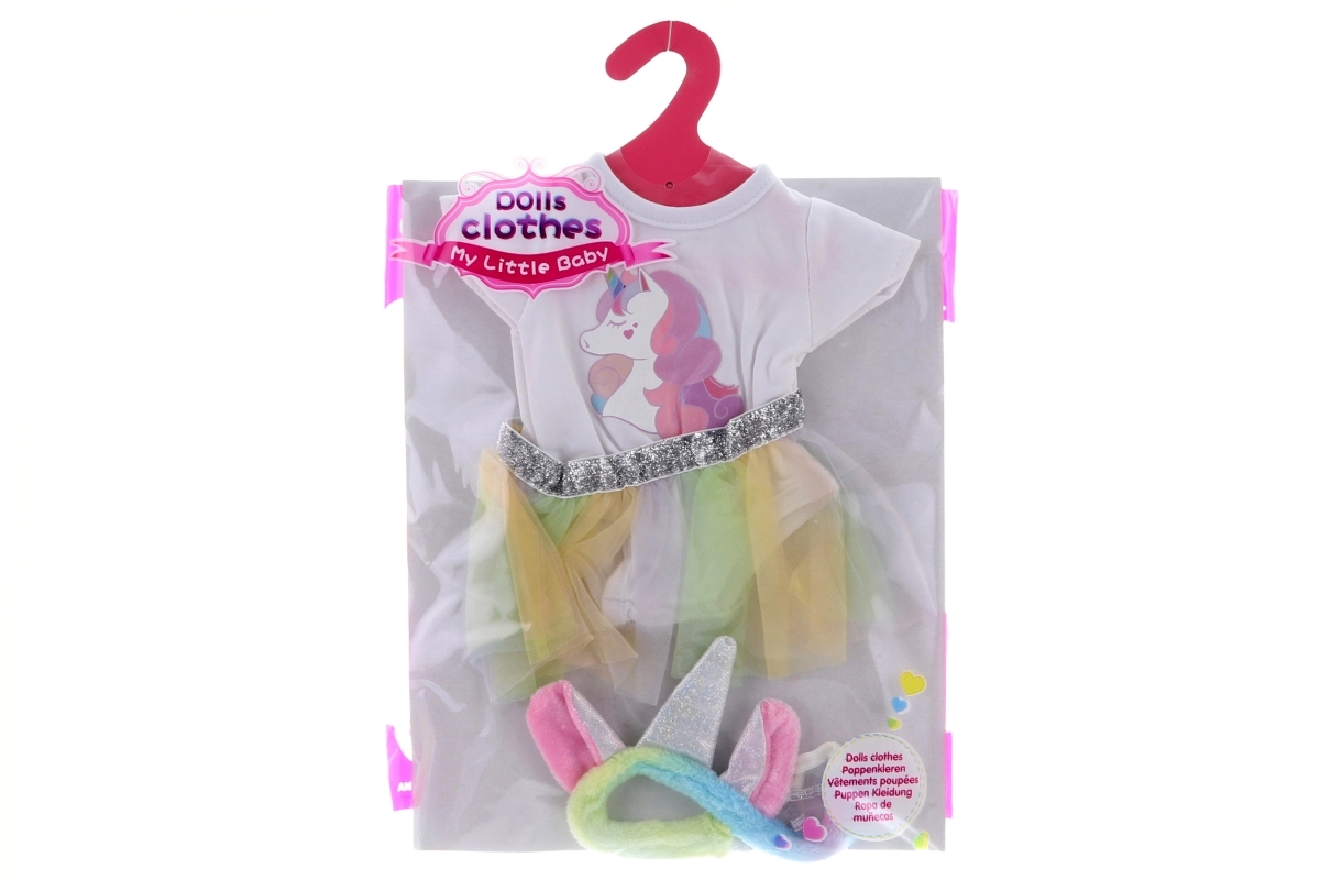 Deze betoverende kledingset voor poppen biedt alles wat je kleine fashionista nodig heeft voor een sprookjesachtige styling. Het body met eenhoornprint, het luchtige tutu-rokje met glinsterende tailleband en de zachte haarband met hoorn vormen samen de perfecte outfit voor elke gelegenheid.