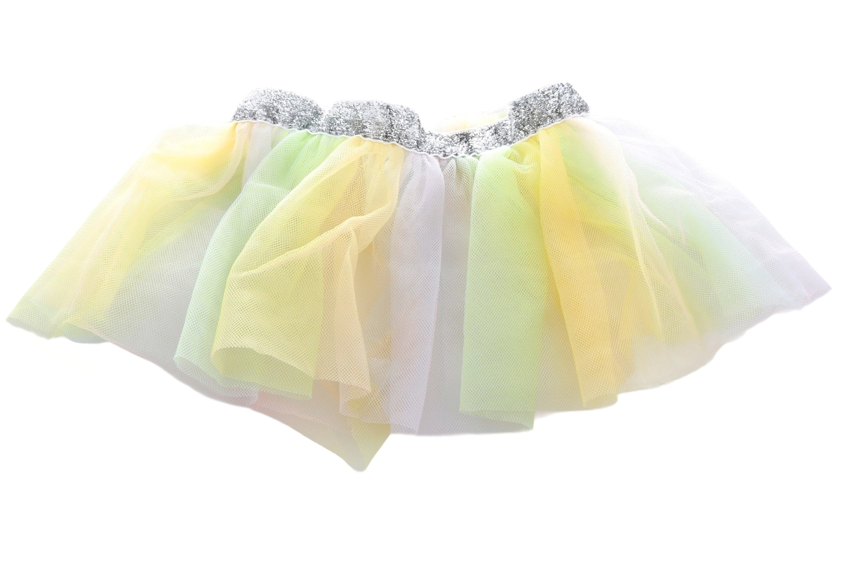 Meerlagige tule in zachte regenboogtinten en een elastische zilveren tailleband zorgen voor comfortabel dragen en makkelijk aankleden.