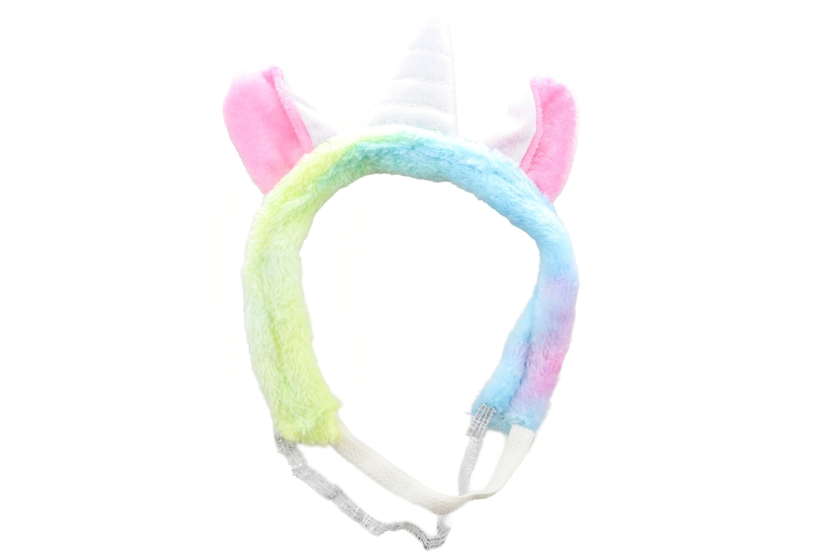 Pluche haarband met een witte hoorn en een pastel band maakt de outfit compleet en tovert de pop om tot een kleine eenhoorn.