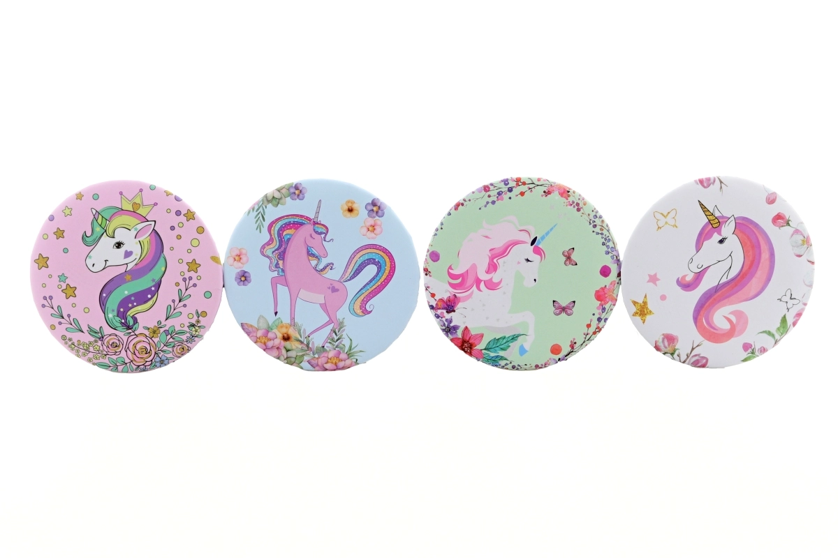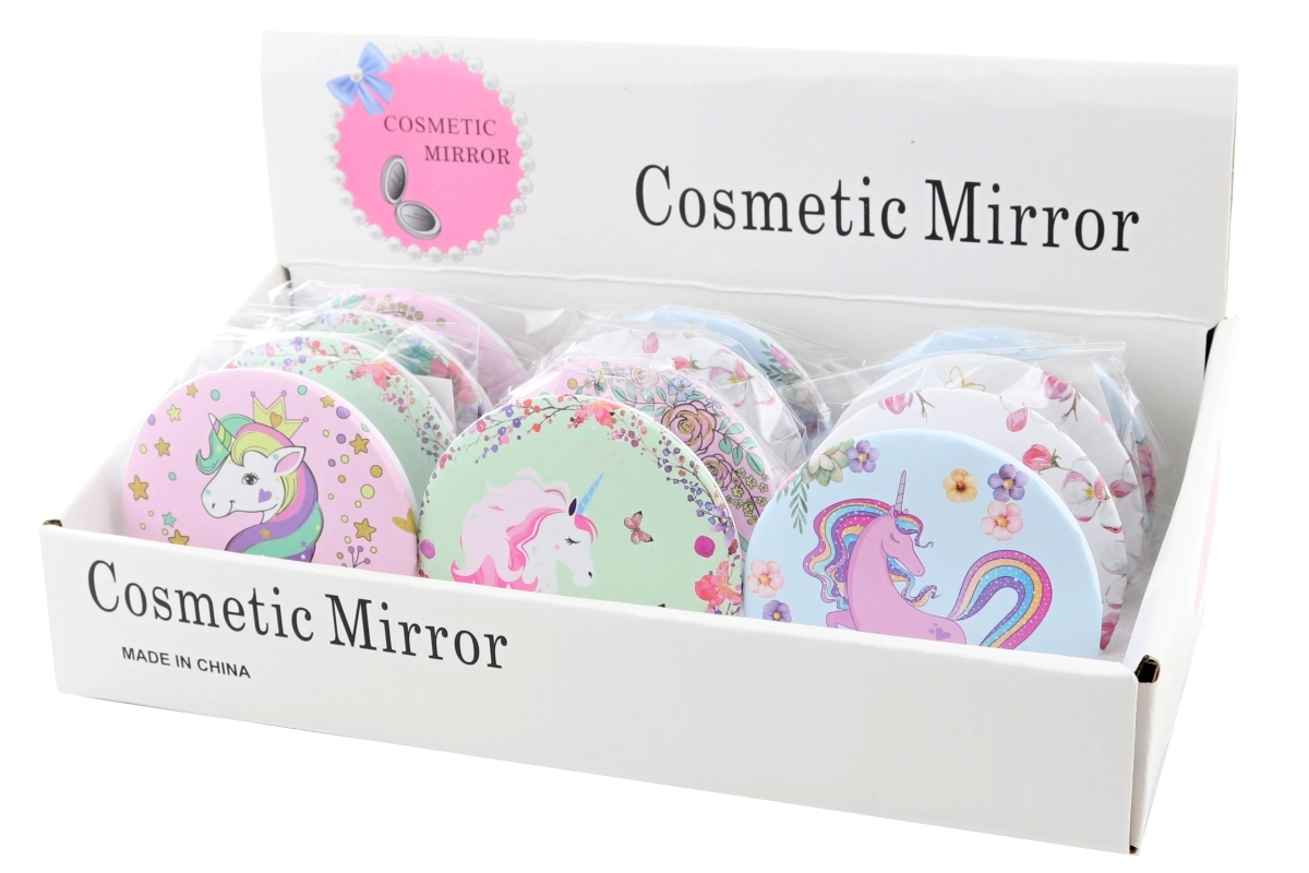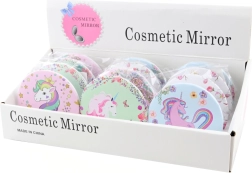Stijlvol rond spiegeltje met een sprookjesachtig eenhoornmotief, ideaal voor dagelijks gebruik of als lief cadeautje. Het compacte formaat van ca. 7 cm past in elke handtas. Lichtgewicht kunststof materiaal, praktische verpakking en verschillende designs afhankelijk van de voorraad. Dit product is geen speelgoed.