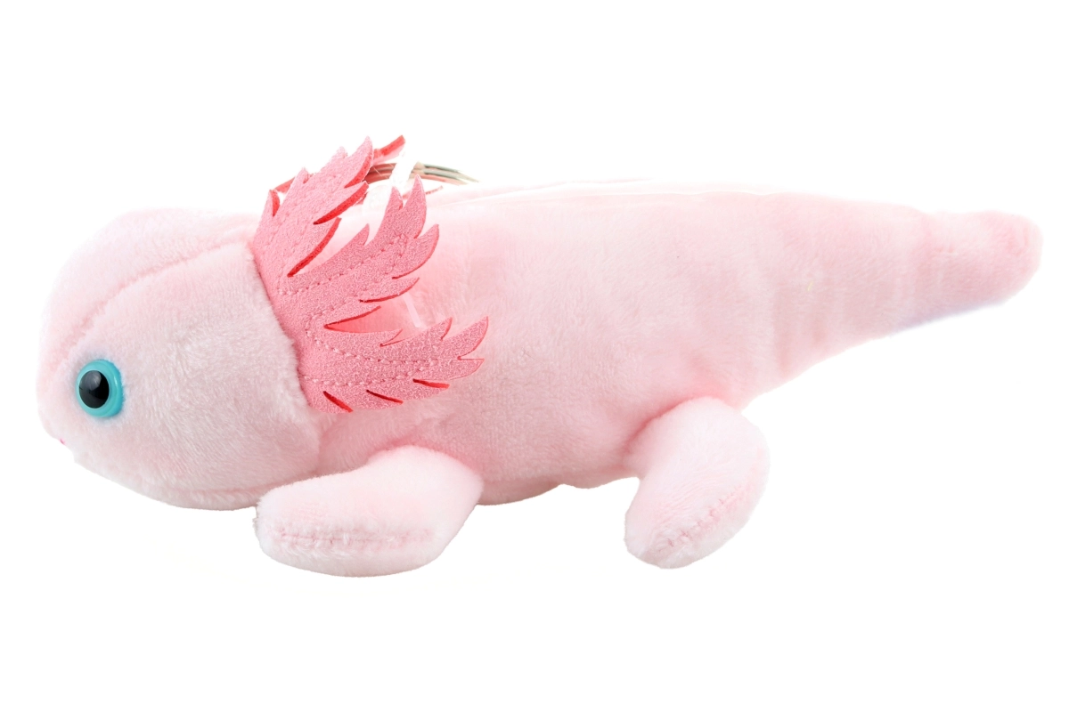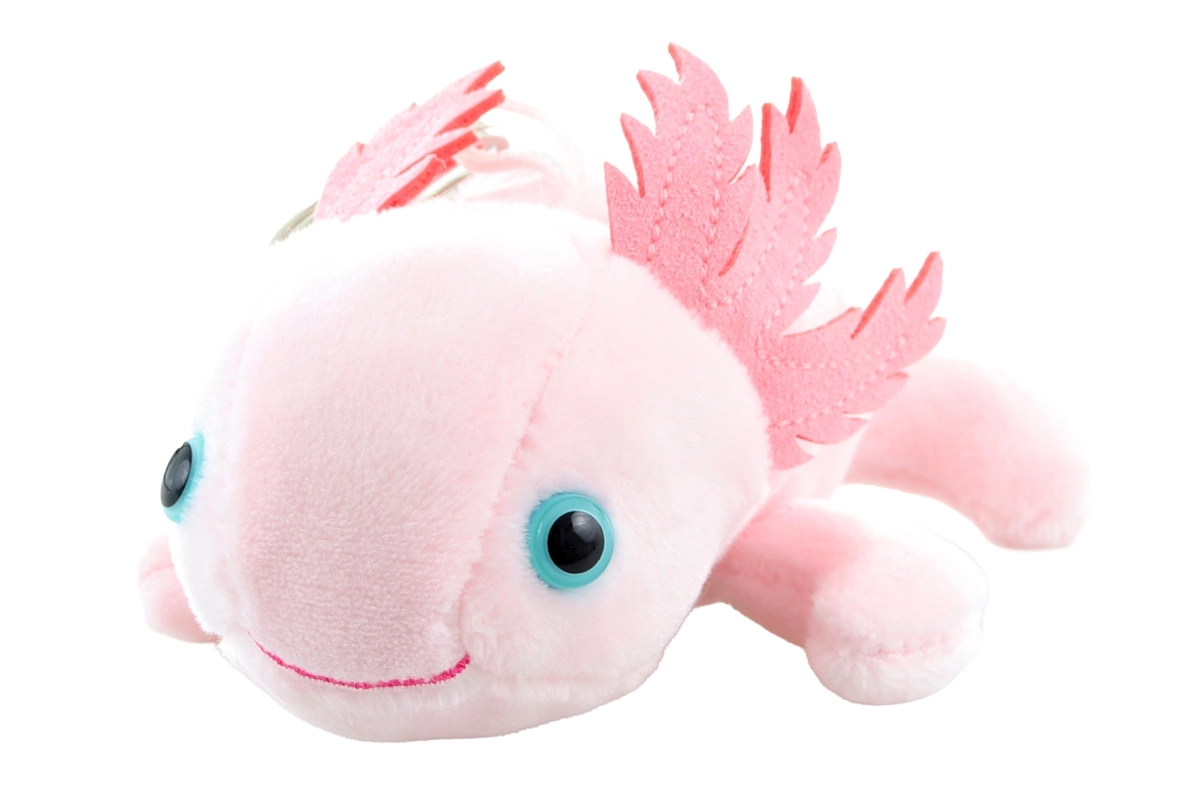 De superzachte stof, geborduurde glimlach en decoratieve kieuwfranjes maken van de axolotl een onweerstaanbaar accessoire.
