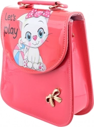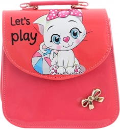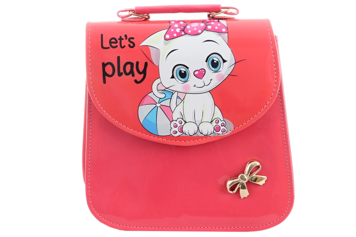 Schattige kinderhandtas met een katjesmotief en de tekst “Let’s play” die kleine fashionista’s zal verheugen. Hij heeft een glanzend oppervlak, praktische drukknoopsluiting en kan in de hand of over de schouder worden gedragen. Binnenin zit één ruime vak voor kleine spulletjes.