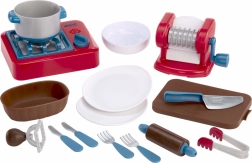 Pasta-extruder, “kookplaatje” met pan, koekenpan, borden, bestek, snijplank, deegroller, plastic mes, etenswaren (brood, boter, sla, tomaat, ui, eieren, pasta, ravioli, gehaktballetjes, cannoli), meel voor “pasta”