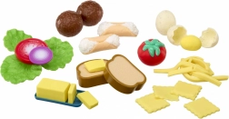 Pannen, koekenpan, borden, bestek, snijplank, deegroller en plastic etenswaren (brood, eieren, slablaadjes, tomaat, ui, boter, gehaktballetjes, cannoli) voor compleet tafelen.