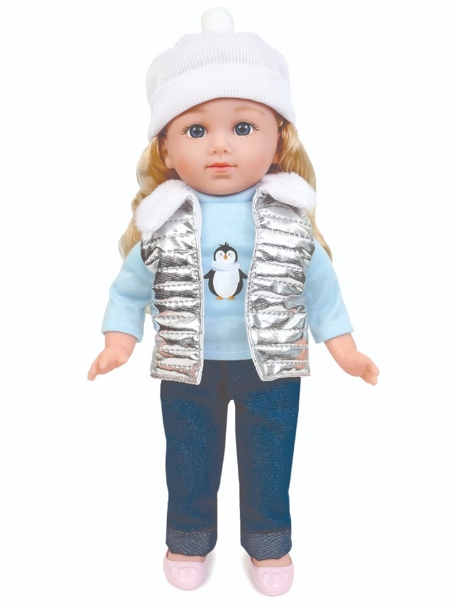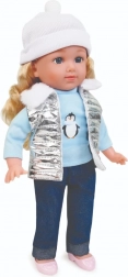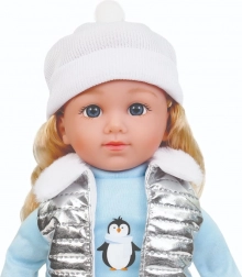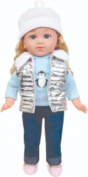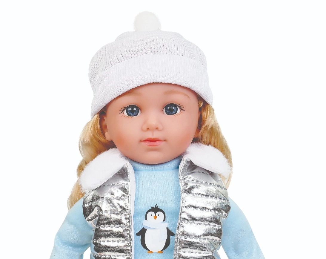 Pop Natalia met een zachte witte muts, een zilverkleurig doorgestikt vest met bontkraag, een lichtblauw T‑shirt met pinguïnprint, donkere broek en roze schoenen is een geweldige speelkameraad voor elke dag. Na het indrukken van haar buikje spreekt ze Poolse zinnetjes en zingt ze 2 melodieën, wat rollenspel ondersteunt en de verbeelding prikkelt.