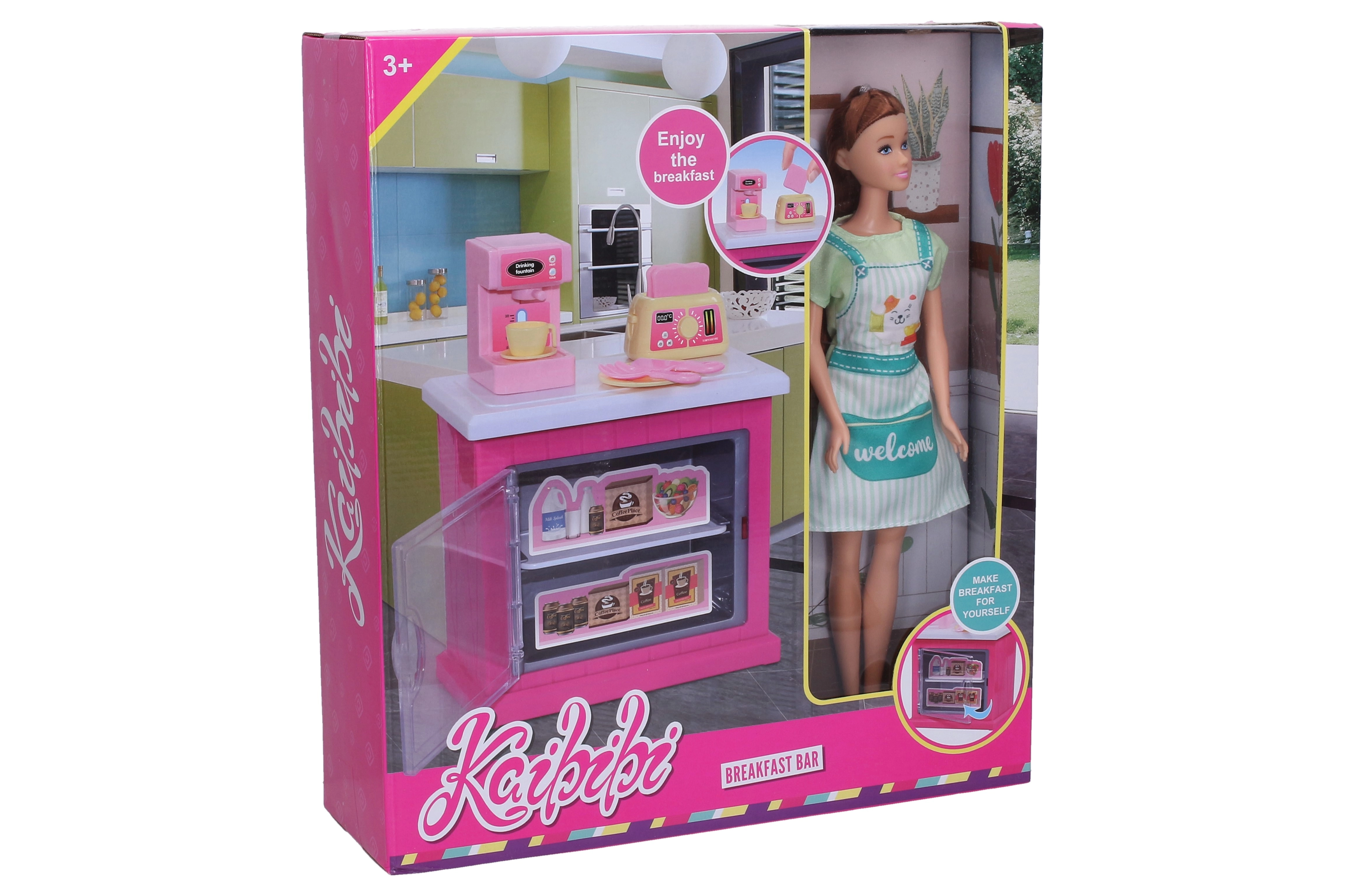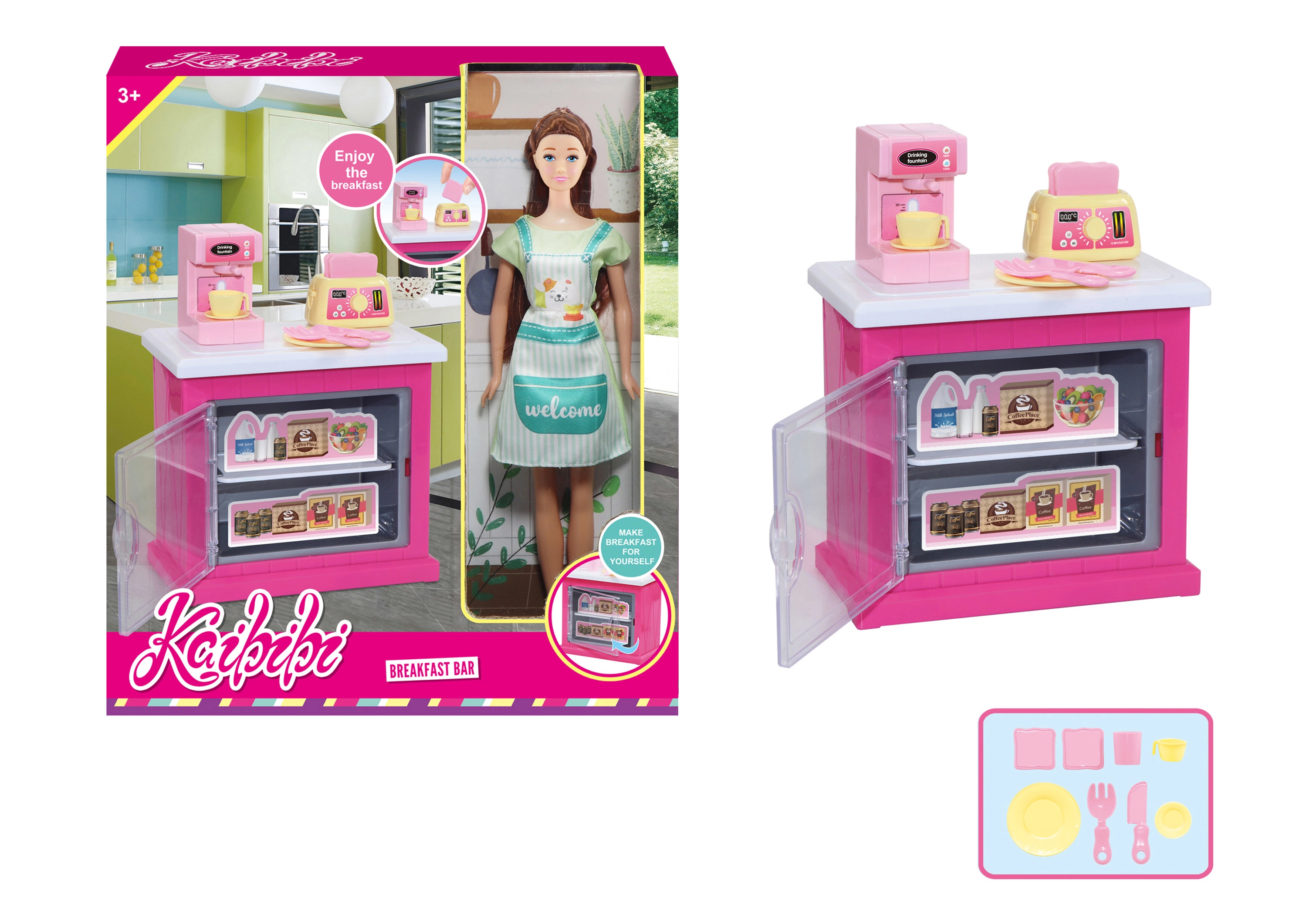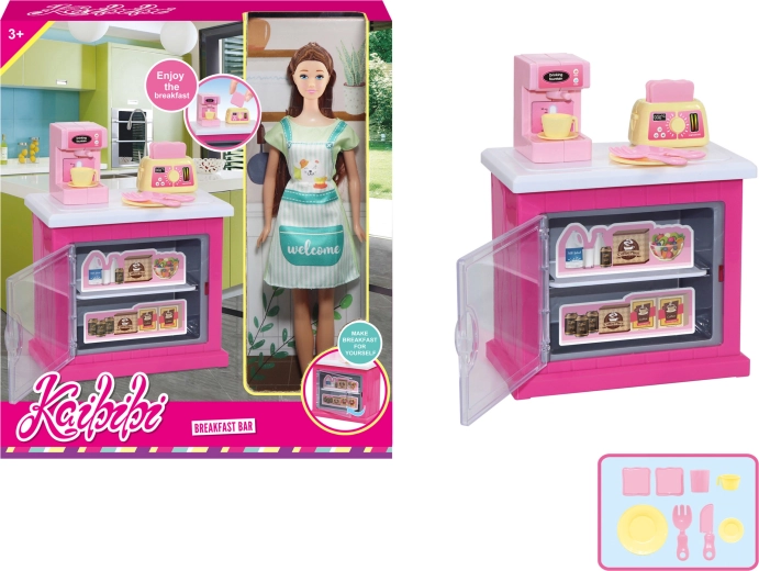 In de verpakking zit een stijlvolle keukenkast, functionele accessoires zoals een koffiezetapparaat en een broodrooster, en andere keukenbenodigdheden waarmee kinderen gemakkelijk “koffietjes” en knapperige toast voor hun gasten kunnen bereiden.