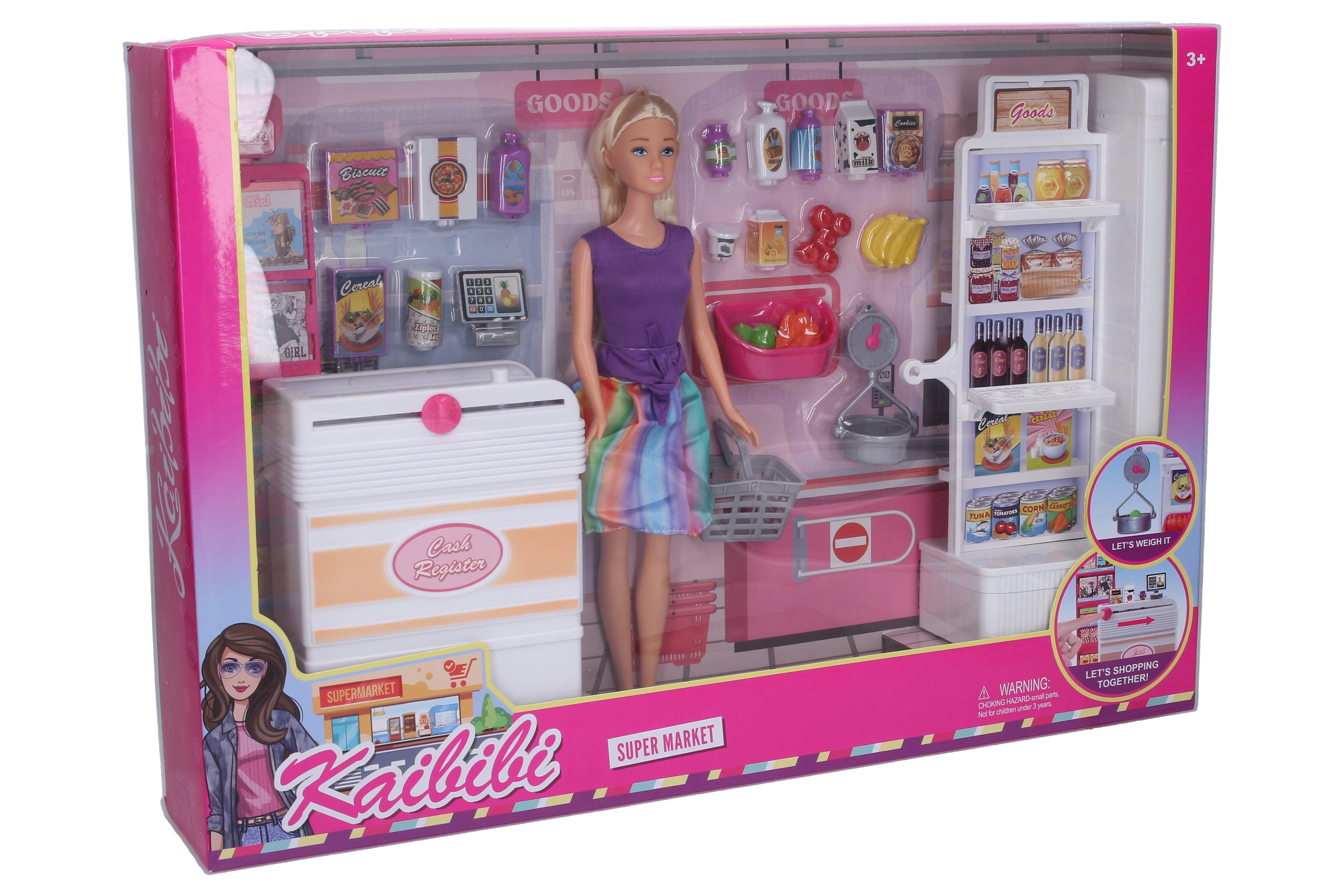- Pop, winkelschap, etenswaren en artikelen, kassa met transportband, winkelmandje, extra accessoires