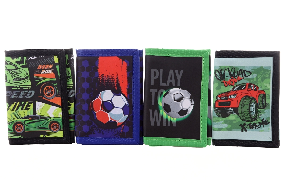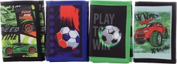 Praktische jongensportemonnee met een aantrekkelijk voetbal- of automotief, ideaal voor elke jonge sporter en liefhebber van snelle wagens. De buitenkant is gegumd voor extra duurzaamheid, binnenin vind je één groot vak met rits en meerdere kleinere vakken zonder sluiting. Perfect voor zakgeld, muntjes en pasjes.