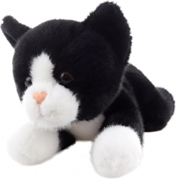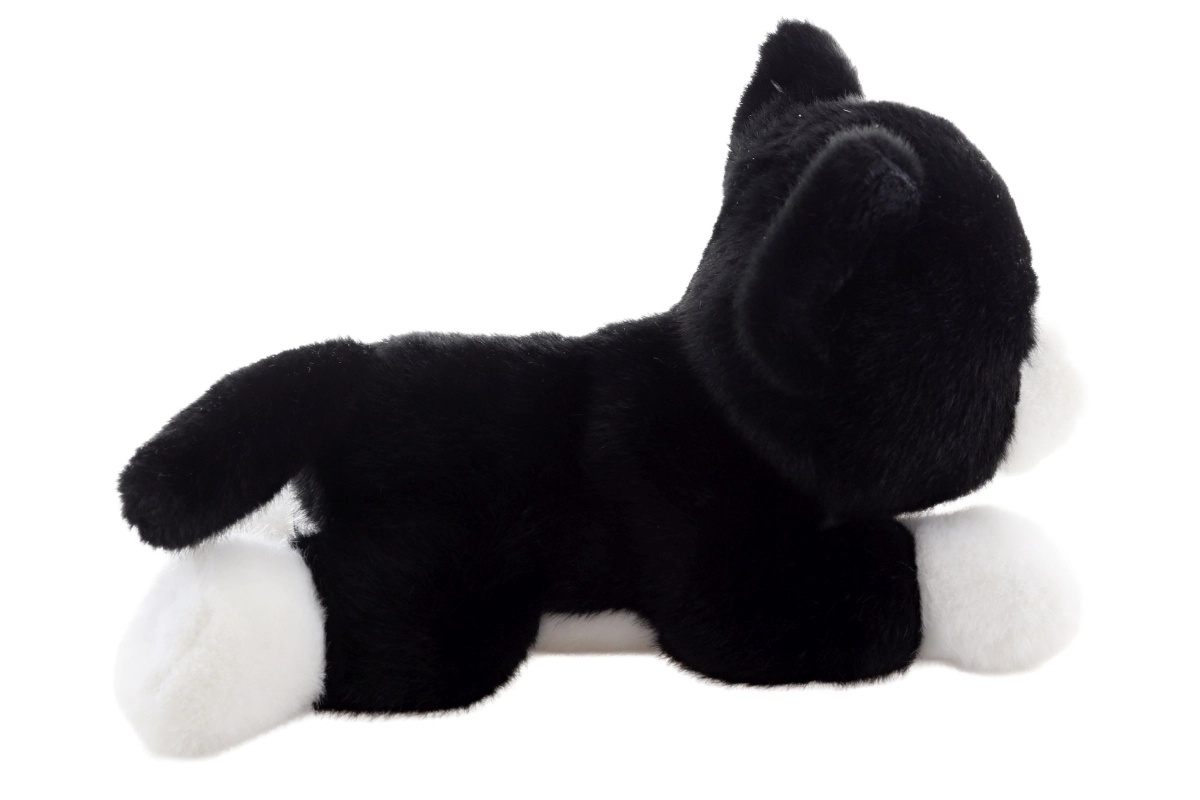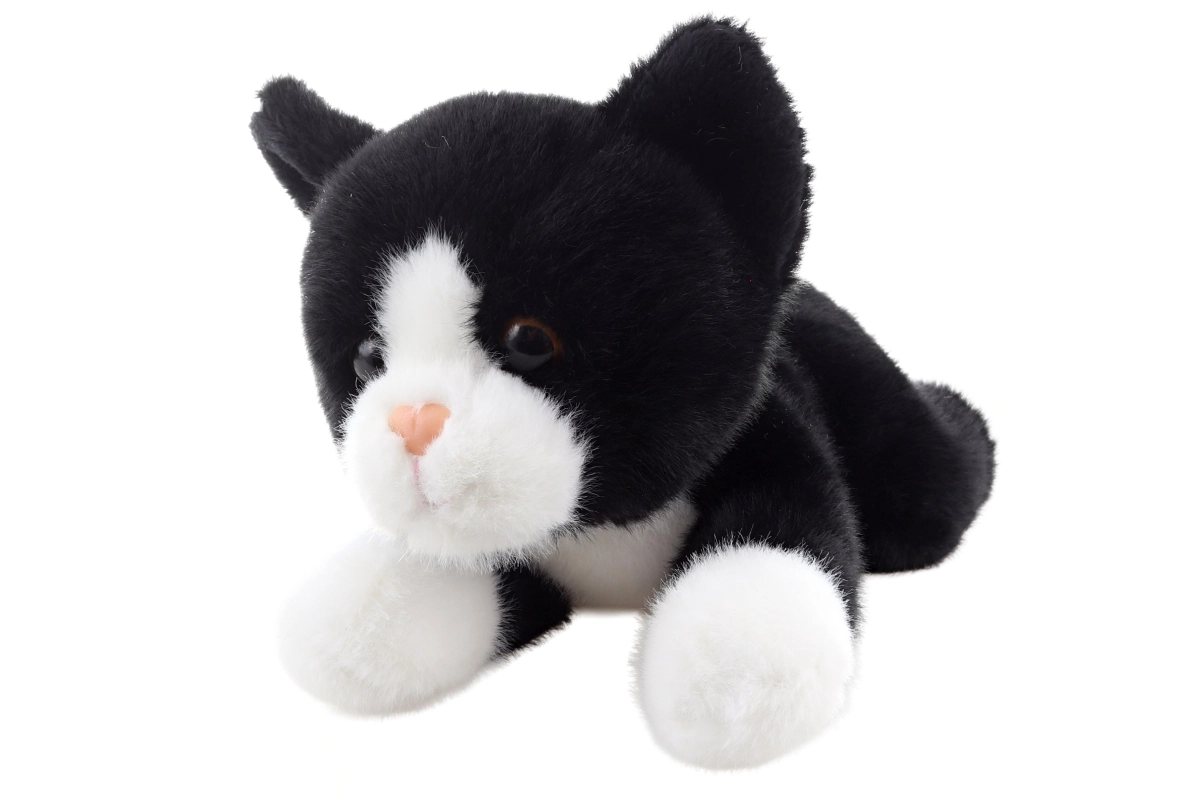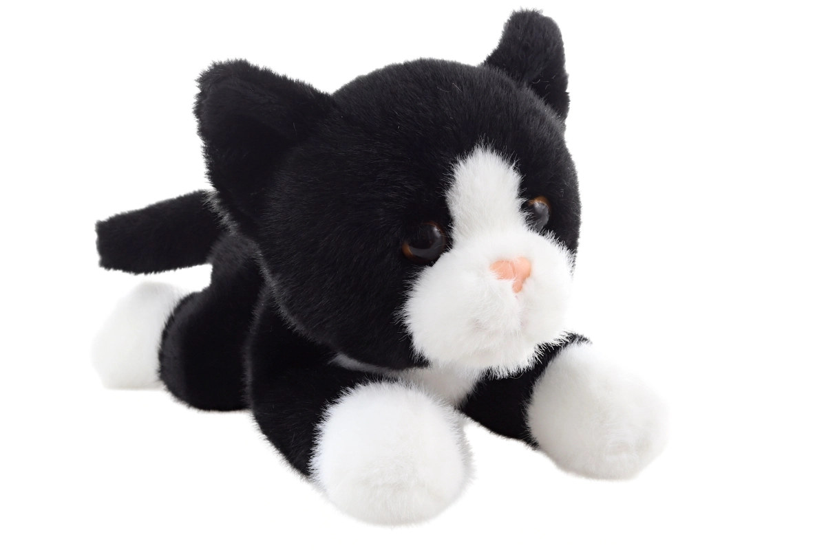 Contrasterende zwart‑witte vacht, een roze neusje en geborduurde details zorgen voor de look van een echt kitten.