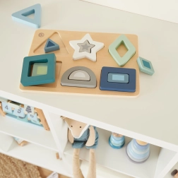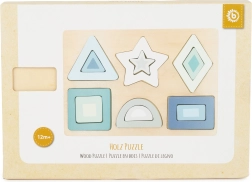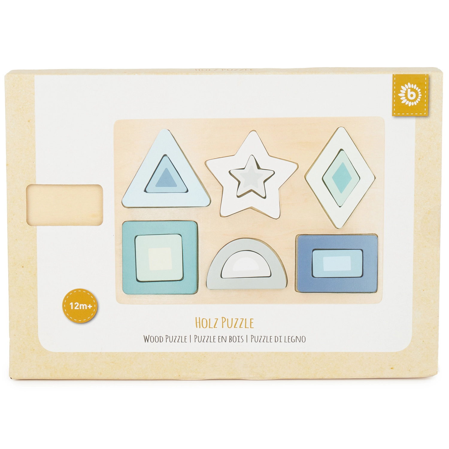 Deze houten inlegpuzzel is een ideale leermiddel voor de eerste kennismaking met vormen en kleuren. Kinderen plaatsen 13 stevige stukken in gefreesde uitsparingen en trainen zo de oog-handcoördinatie, de fijne motoriek en het probleemoplossend denken. Dankzij de aangename pasteltinten en het gladde oppervlak is de hantering veilig en aansprekend.