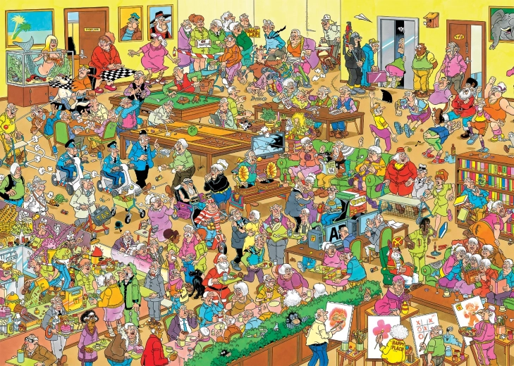 Ontdek grap na grap in de originele illustratie “Verpleeghuis” van Jan van Haasteren, exclusief gemaakt voor het merk JUMBO. De typische stijl vol humor, talloze personages en onverwachte situaties zuigt je erin en laat je niet meer los.