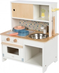 Compacte kinderkeuken in moderne Scandinavische stijl met een kleurrijk terrazzo-patroon voor realistisch kookspel in elke kinderkamer. Voorzien van draaiknoppen met klikgeluid, een oven met magnetische deur, een uitneembare metalen spoelbak en accessoires waaronder een koekenpan, een pan met deksel en een houten spatel. Dankzij de werkhoogte van 22 cm ideaal voor kleine handjes en ook als poppenkeuken (ca. 43 cm).