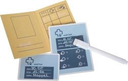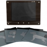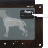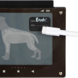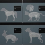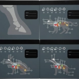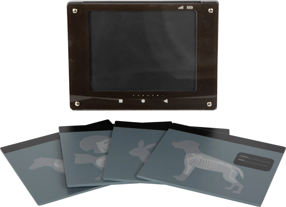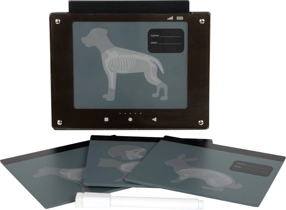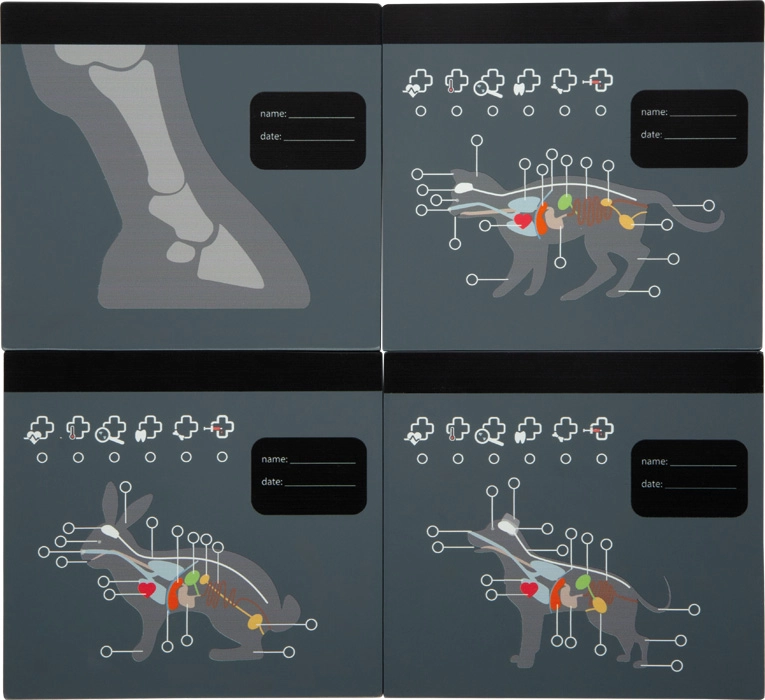 Interactieve “röntgen” met transparante dierenkaarten (hond, kat, konijn, paard) stimuleert de verbeelding en legt de lichaamsbouw spelenderwijs uit. Het notitieveld biedt ruimte voor de naam van de patiënt en de datum van het onderzoek.
