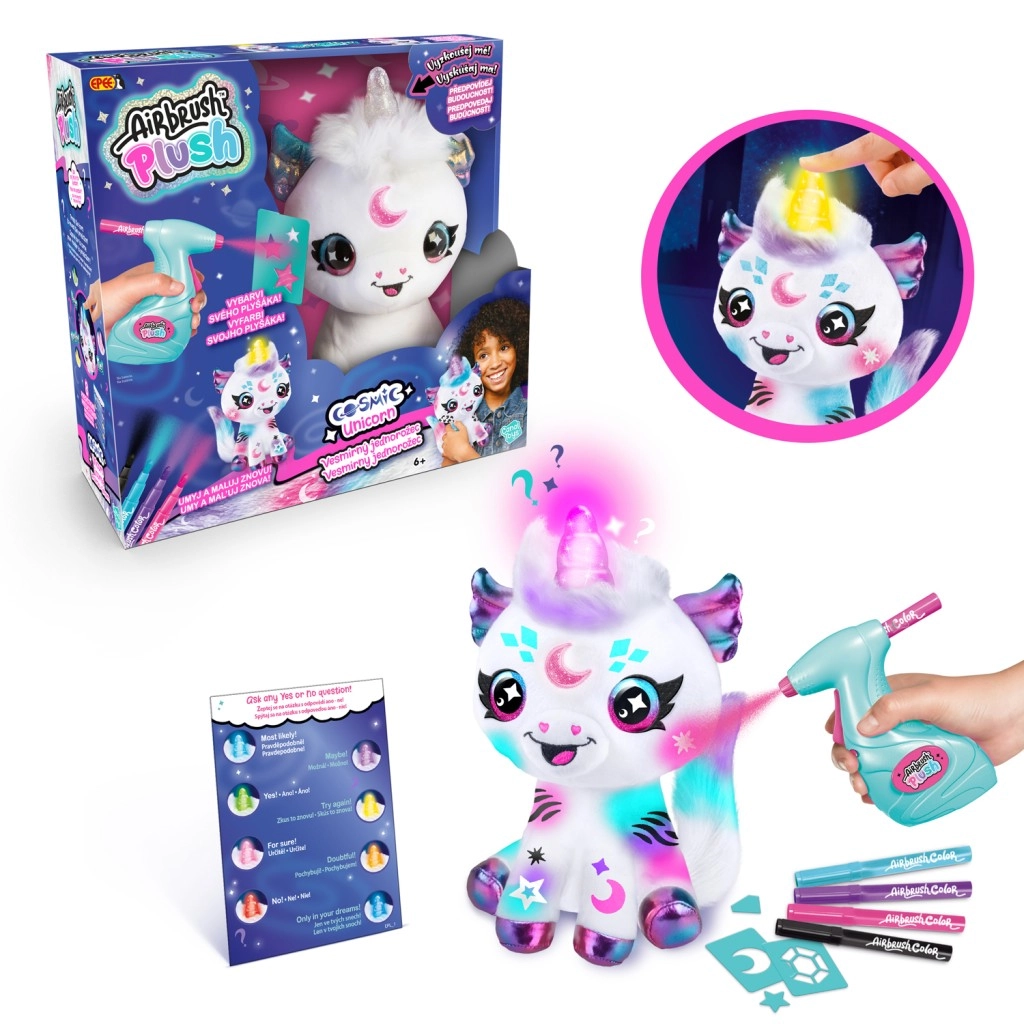 Ontdek de magie van creëren met de unieke set Airbrush-studio – kosmische eenhoorn. In de verpakking vind je een pluchen knuffel, een airbrush-tool, 4 gekleurde navullingen en 100 sjablonen voor eindeloze ontwerpcombinaties. Gemakkelijk afwasbare kleuren maken herhaaldelijk ontwerpen mogelijk, terwijl de lichtgevende magische hoorn interactieve pret toevoegt met ja/nee-antwoorden. Ideaal creatief cadeau voor kinderen vanaf 6 jaar.