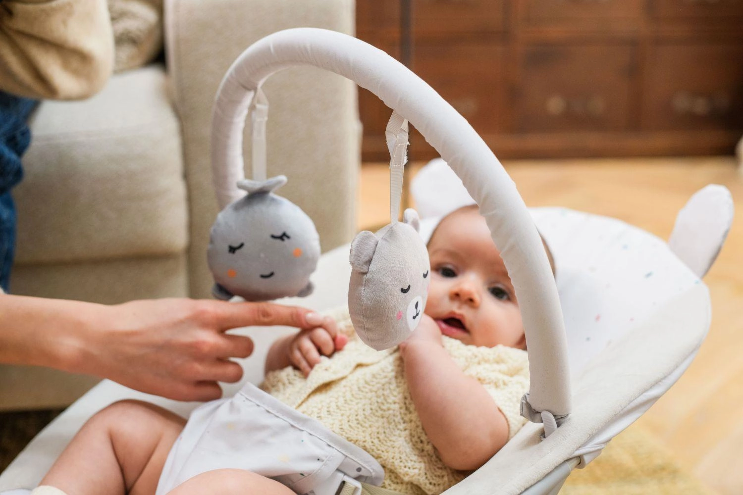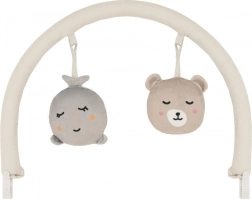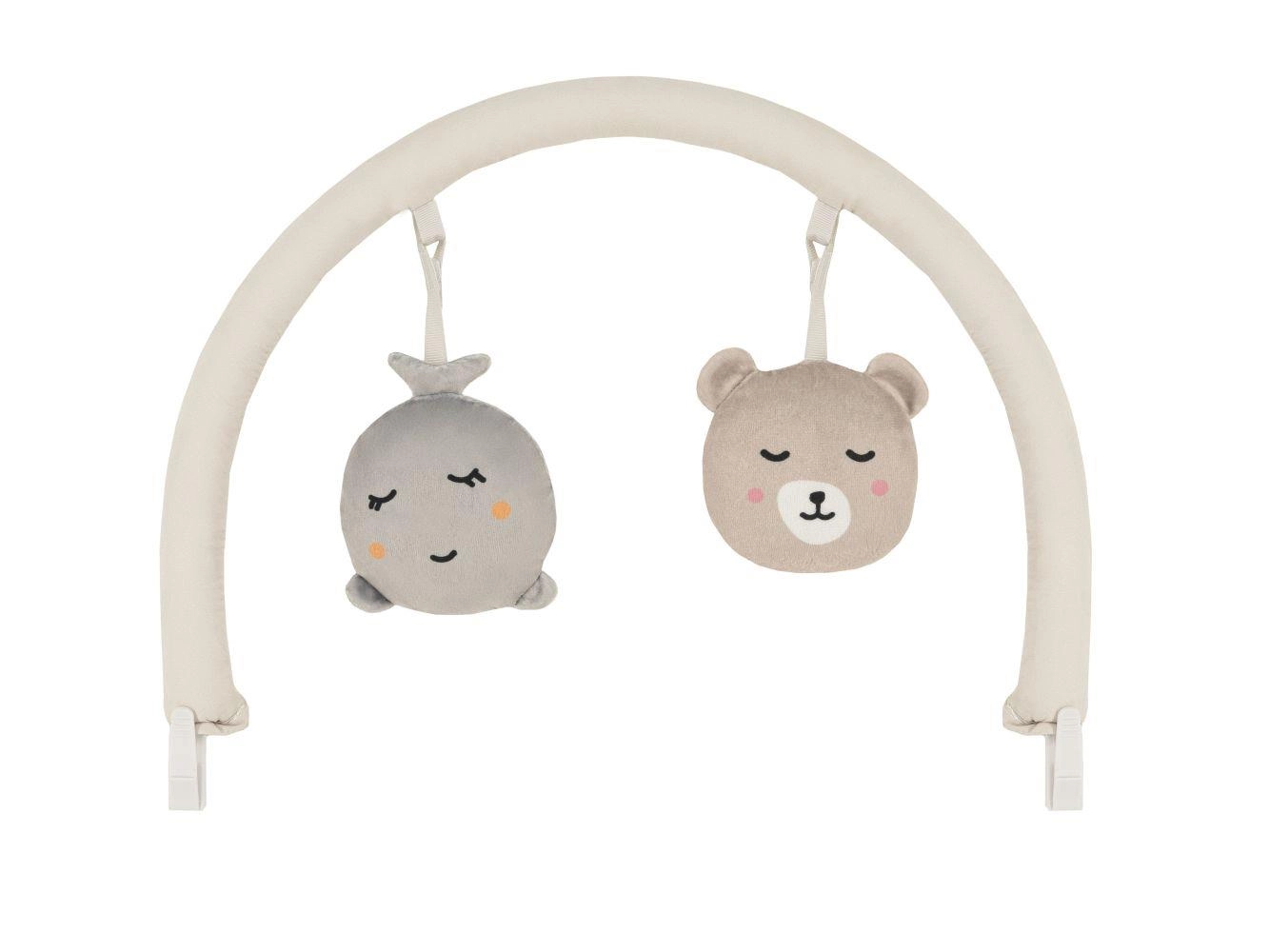 De afneembare speelboog met twee zachte speeltjes stimuleert zicht, tast en de coördinatie van hand en oog.