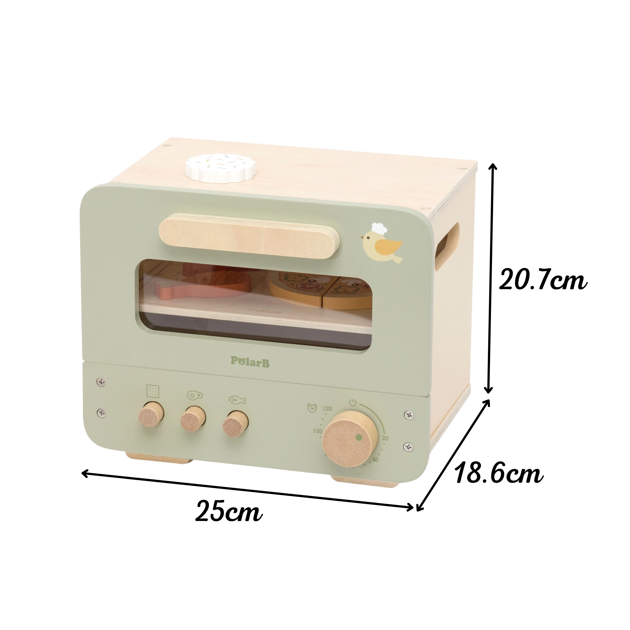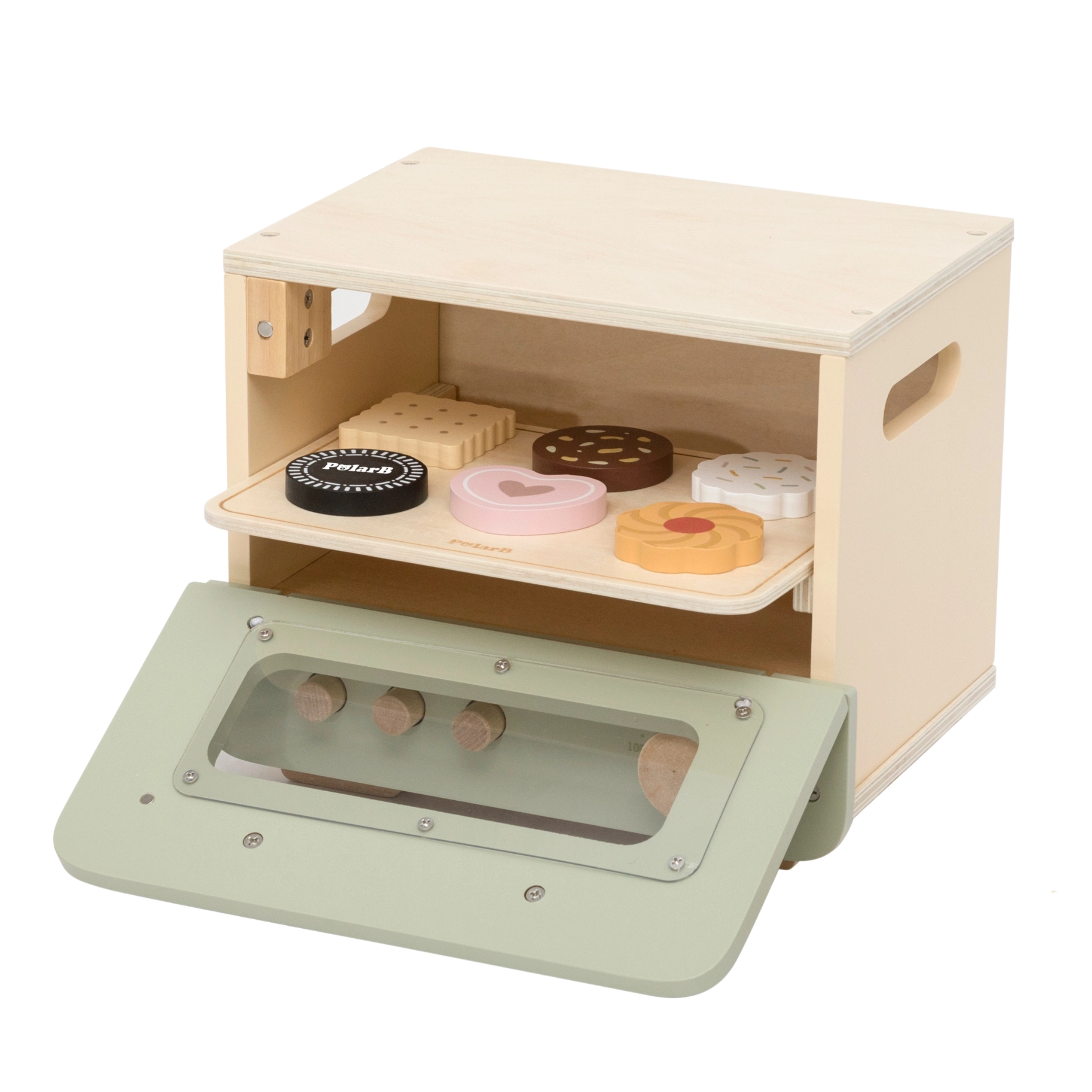 Deze stijlvolle kinderoven in groen-beige uitvoering biedt kinderen een authentieke bakervaring. Het transparante raampje, de functionele knoppen en de afneembare bakplaat nodigen uit tot creatief serveren van zoete en hartige lekkernijen. Kinderen kunnen de mini pizza snijden en samenstellen, koekjes bakken en tegelijk hun behendigheid en communicatie trainen tijdens rollenspel.