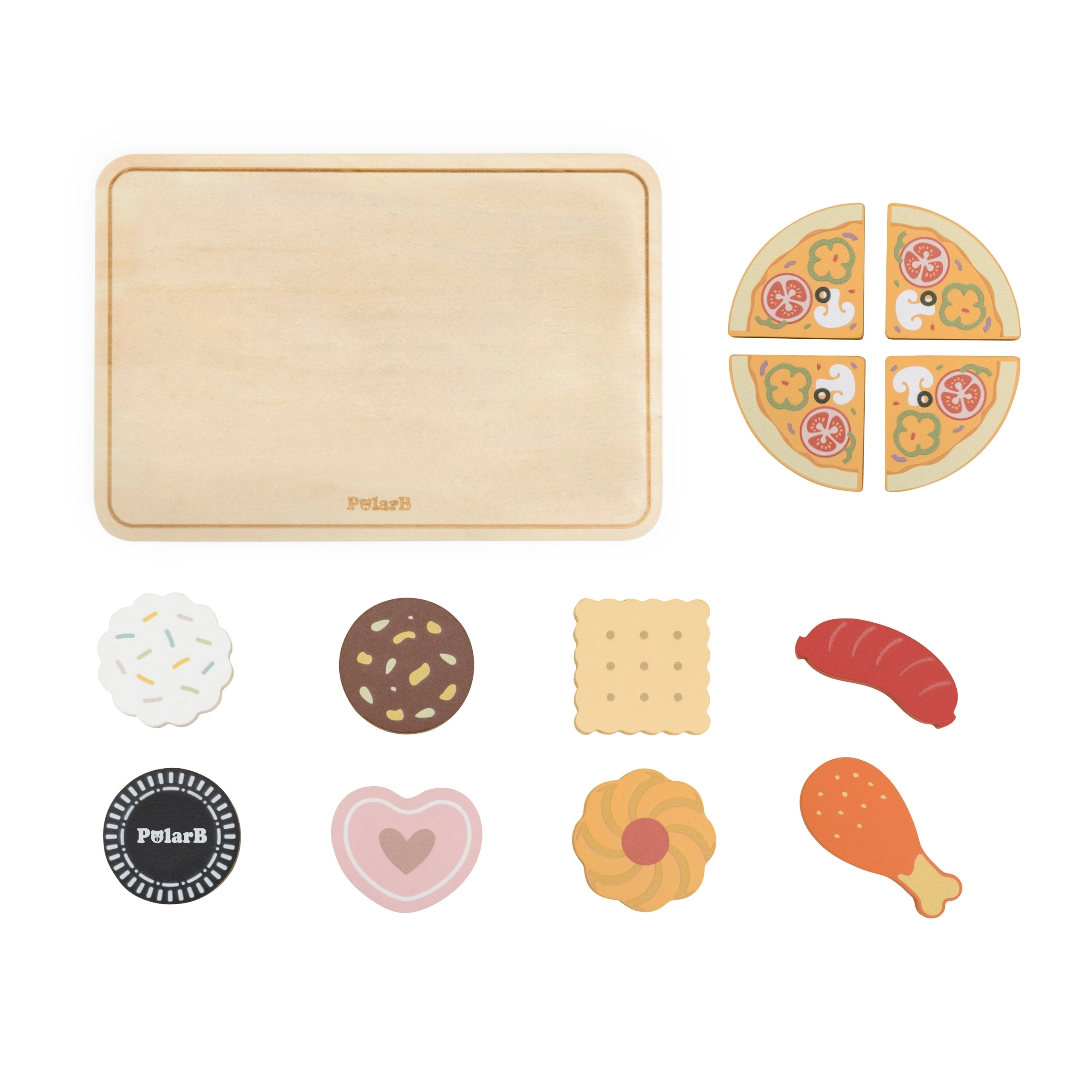 - Rijke accessoires: 12 houten etenswaren inclusief koekjes, pizza (4 delen), worstje en kippenpoot.
