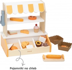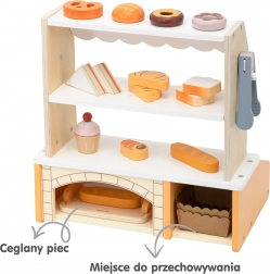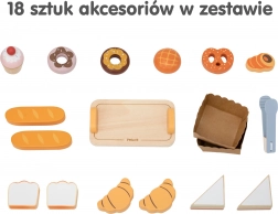 De set bevat een rijke selectie brood en tools: dienblad, tang, papieren mandjes en diverse soorten houten lekkernijen (kruidentoastjes/rolletjes, donuts, baguettes, toast, pretzel, muffins en meer). Het spel stimuleert op natuurlijke wijze de fijne motoriek, oog-handcoördinatie, communicatie en zelfvertrouwen bij het “bedienen” van klanten.