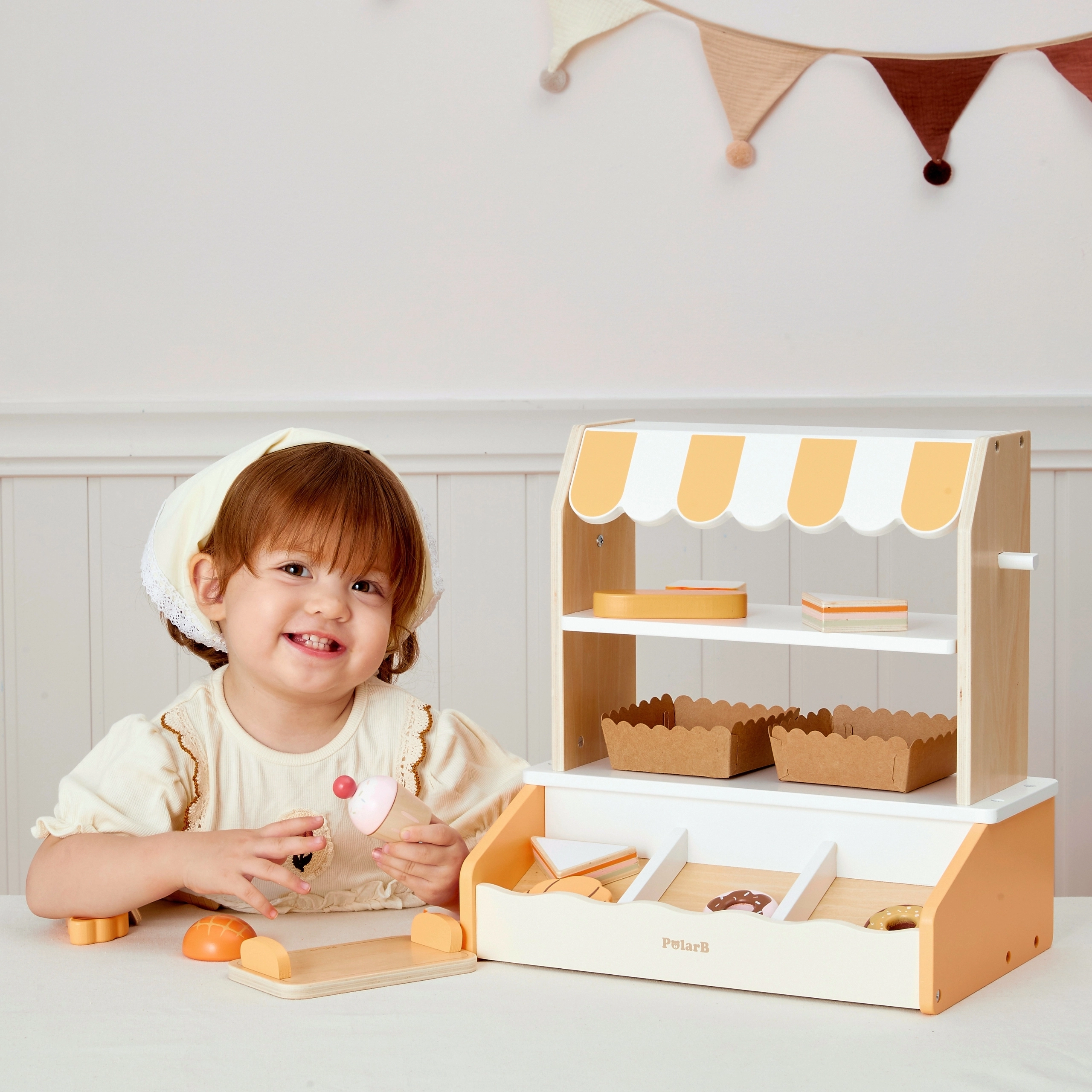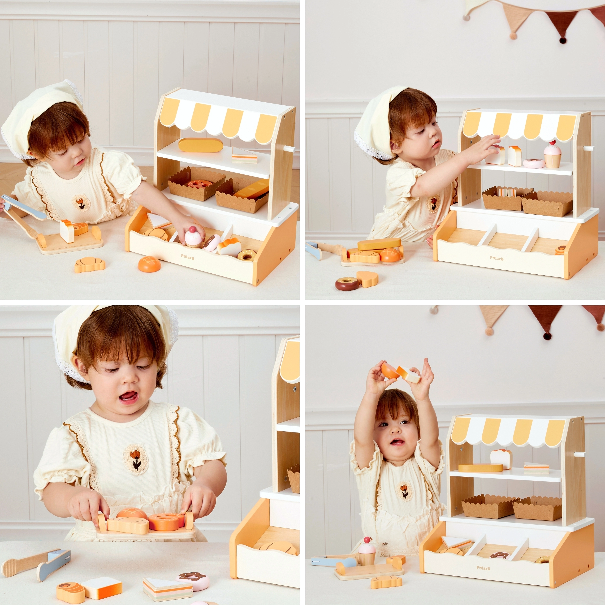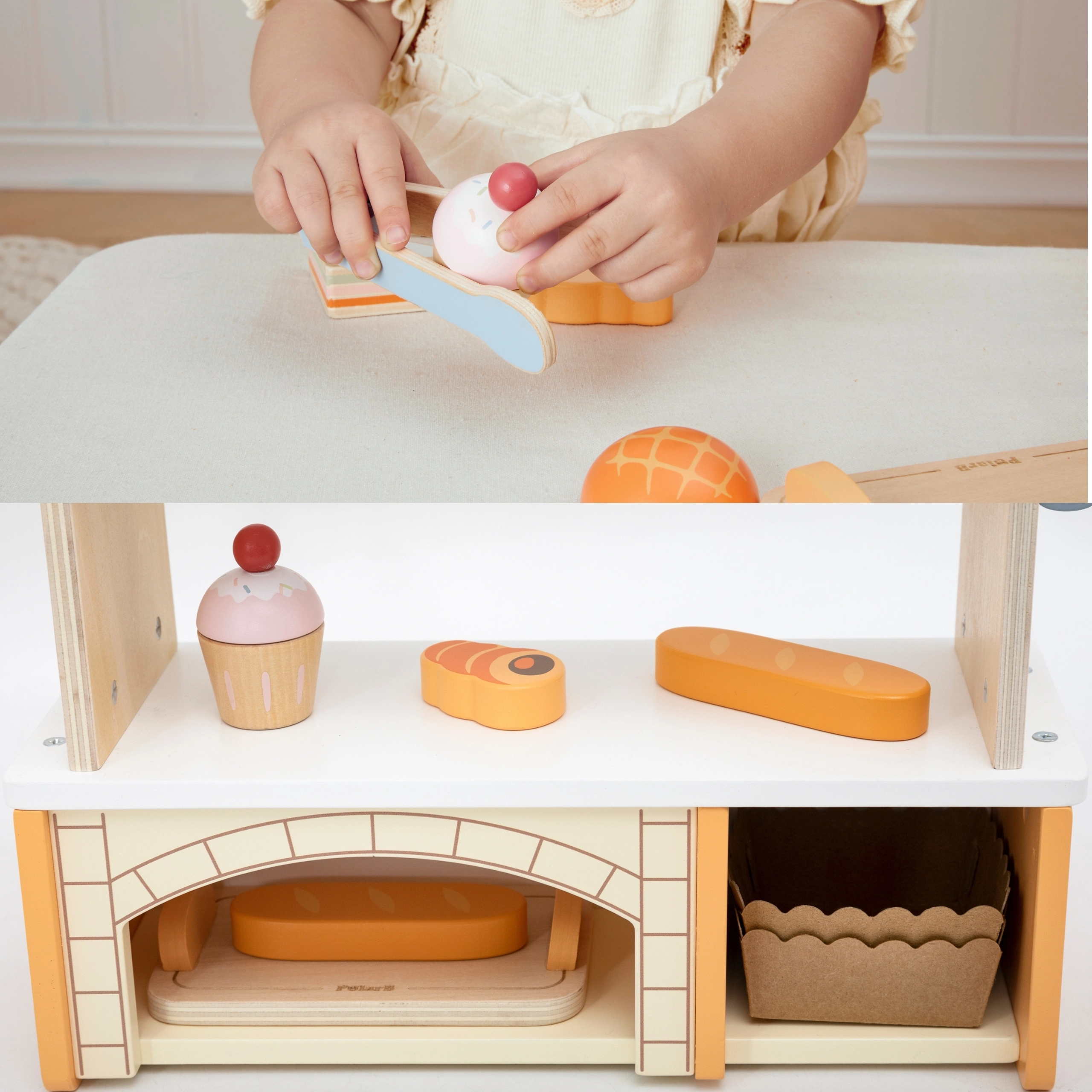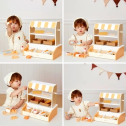 Deze stijlvolle houten mini-bakkerij biedt kinderen realistisch winkelspel – met twee presentatieplanken, vakken voor brood en kleine lekkernijen om te sorteren en te serveren. Dankzij de compacte afmetingen en zachte pastelkleuren past hij mooi in elke kinderkamer.