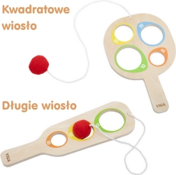 Een leuk houten spel van VIGA om handigheid te trainen en lekker te spelen. Twee palletjes met verschillende vormen en genummerde gaten en twee zachte balletjes aan een koord stimuleren oog-handcoördinatie, precisie en geduld. Veilige uitvoering met stevig bevestigde balletjes, ideaal voor binnen en buiten.