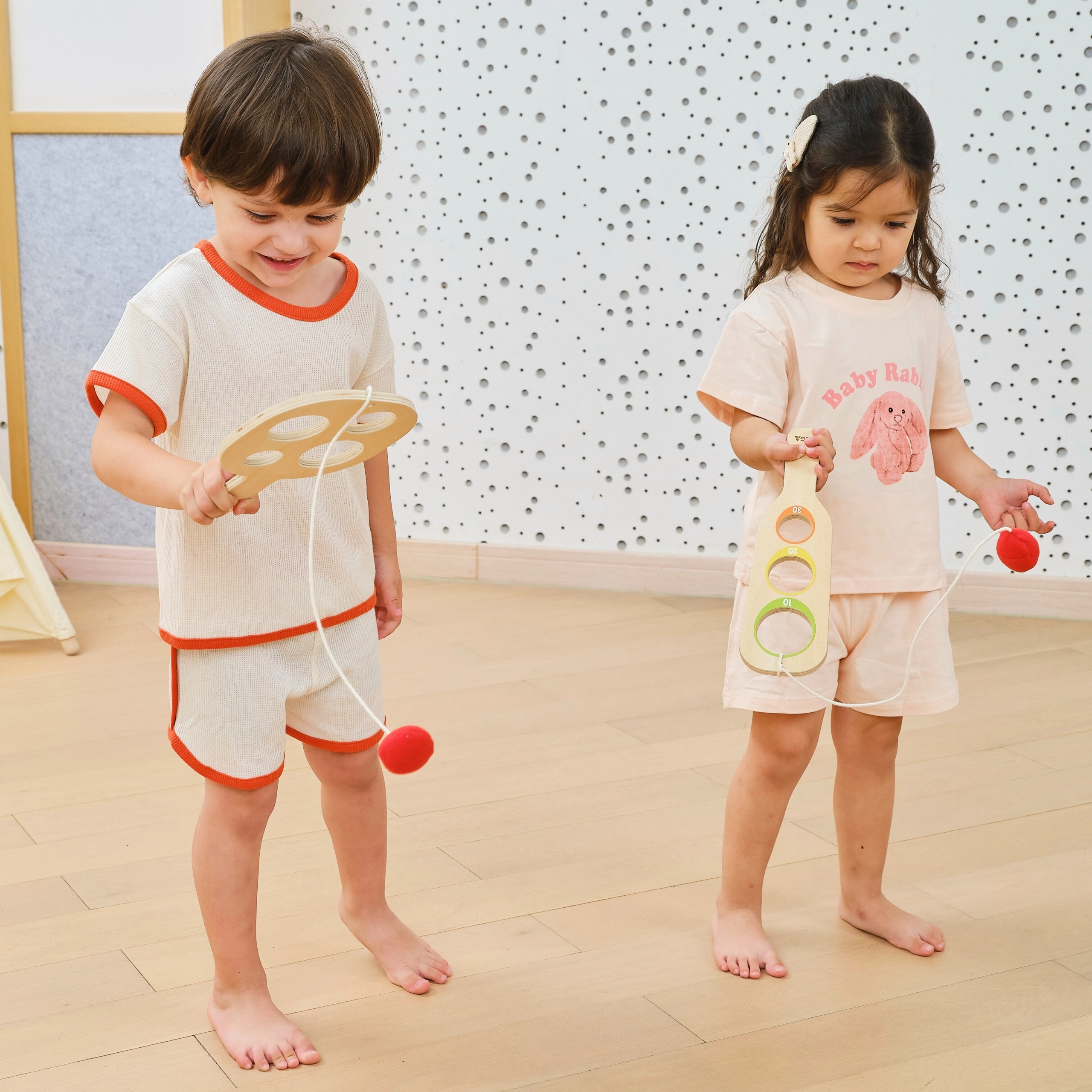 Ontdek een verslavend behendigheidsspel dat kinderen aanzet tot beweging en focus. Twee houten palletjes – één langer en één compacter – hebben meerdere ronde gaten met puntentelling (10–50). Doel is om met een zwaai het zachte balletje aan een koord door het kleinste gat te krijgen voor meer punten. Geschikt voor solo-spel en vriendschappelijke mini-toernooien.