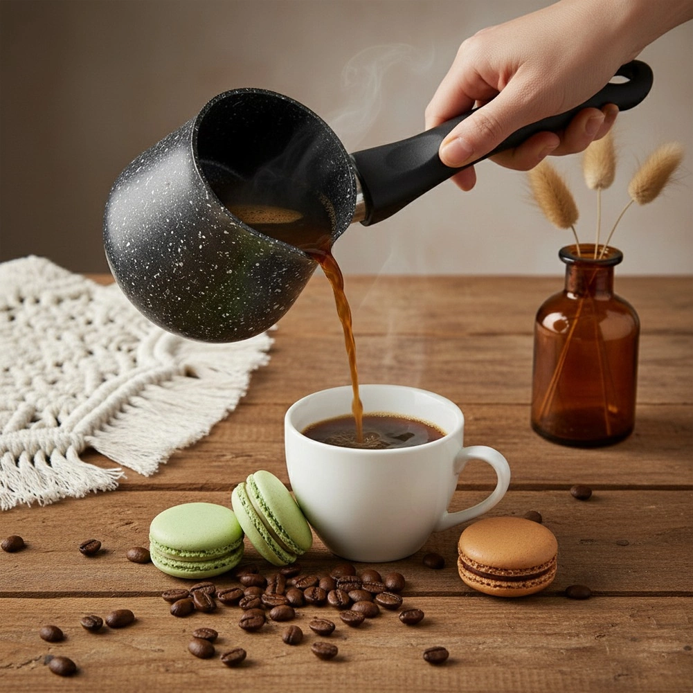 Ontdek de traditionele bereiding van Turkse koffie met modern comfort. De granieten cezve Grande combineert een stevige aluminium behuizing met een antiaanbakafwerking voor schoon koken zonder aanbakken. Dankzij de brede rand met schenktuit schenkt u precies en zonder druppels, terwijl de lange handgreep zorgt voor een veilige en comfortabele grip.