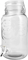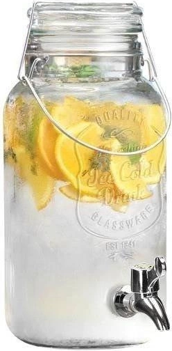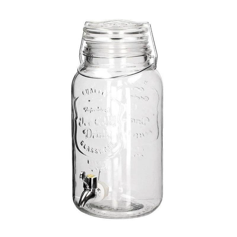 Stijlvolle glazen dispenser met een inhoud van 4 l, ideaal voor het serveren van limonade, water, sappen of punch. Voorzien van een praktisch kraantje, een brede vulopening voor eenvoudig reinigen, een lucht- en lekdicht deksel met afdichting met klem tegen insecten en een decoratief reliëf dat prachtig uitkomt op tuinfeesten en thuis.