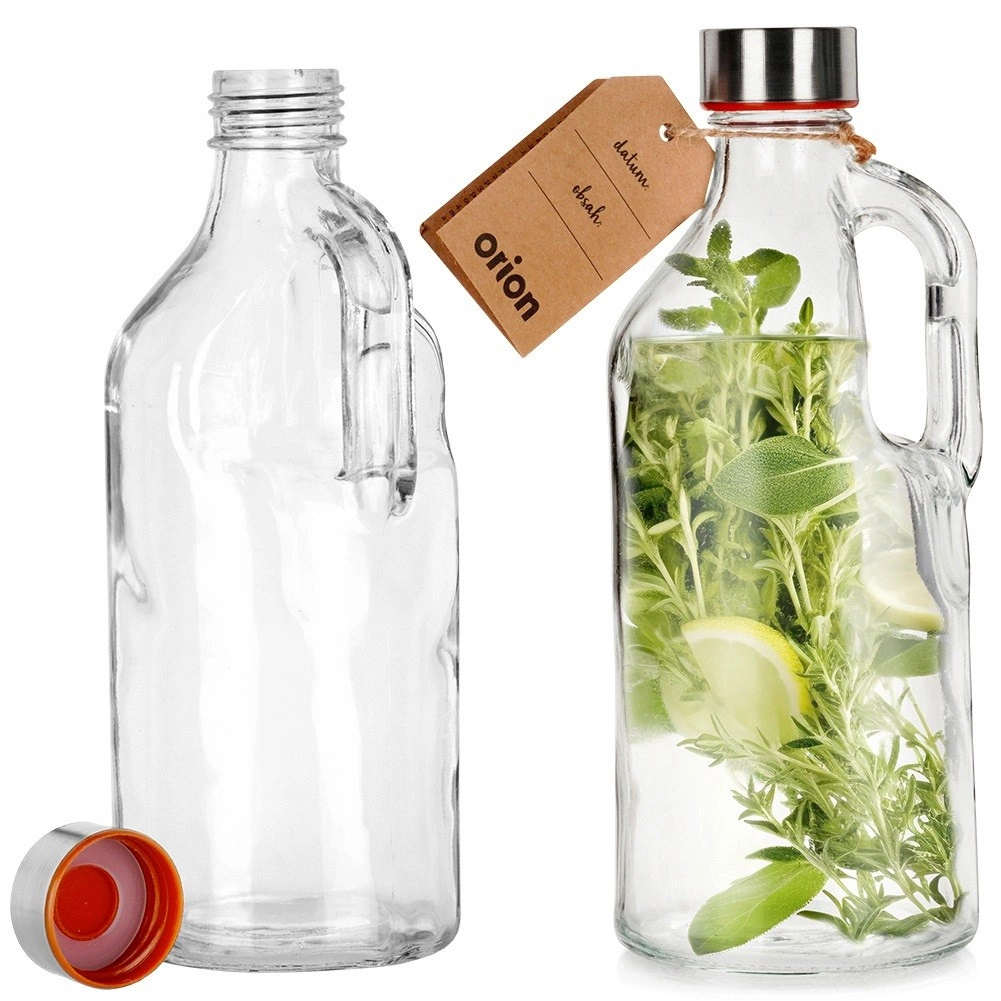 Deze glazen fles met handgreep is een uitstekende keuze voor water, sappen, limonades, smoothies en ook voor huisgemaakte siropen of likeuren. Het transparante glas maakt controle van de inhoud mogelijk; de metalen dop met siliconen afdichting voorkomt betrouwbaar lekken en houdt dranken langer vers. Dankzij de handgreep ligt de fles prettig in de hand en schenk je eenvoudig.