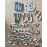 1× ketting (1,5 m), 2× karabiner, 4× houtschroef, 4× muurplug, 1× ronde plafondhaak, 1× S-haak