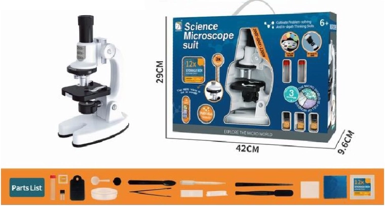 De set bevat 16 accessoires die creativiteit en leren ondersteunen. De compacte behuizing van duurzaam kunststof materiaal en de afmetingen 25 × 14 × 8,7 cm zijn geschikt voor kinderhanden. De voeding verloopt via algemeen verkrijgbare 2× AA-batterijen (niet inbegrepen), zodat de microscoop altijd en overal gebruikt kan worden.