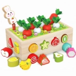 Ontdek een leuke educatieve speelgoedset voor de allerkleinsten – een houten wortel-sorter met wagentje. Kinderen oefenen fijne motoriek, hand-oogcoördinatie en het herkennen van vormen en kleuren. De set bevat blokjes in de vorm van wortels en fruit, een houten konijntje en schattige “rupsjes”. Het speelgoed is van hoogwaardig hout, heeft prettig afgeronde randen en is ideaal voor kinderen vanaf 36 maanden. Educatief speelgoed, natuurlijk materiaal en kleurrijke elementen voor uren speelplezier.