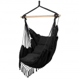 Geniet maximaal van ontspanning met de stijlvolle hangende Braziliaanse stoel in donkergrijs. Het comfort wordt gewaarborgd door twee kussens en een zachte hoofdsteun, terwijl de stevige houten dwarslat voor stabiliteit zorgt. De duurzame mix van 65% katoen en 35% polyester is aangenaam aanvoelend en tegelijkertijd slijtvast. Praktische zijvakken houden alles wat u nodig heeft binnen handbereik.